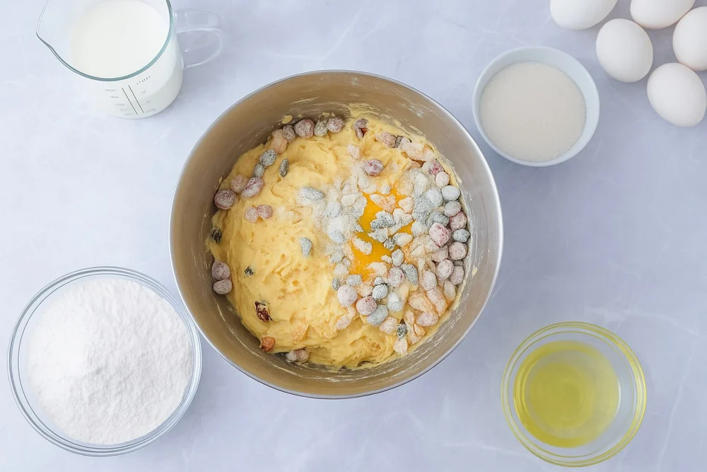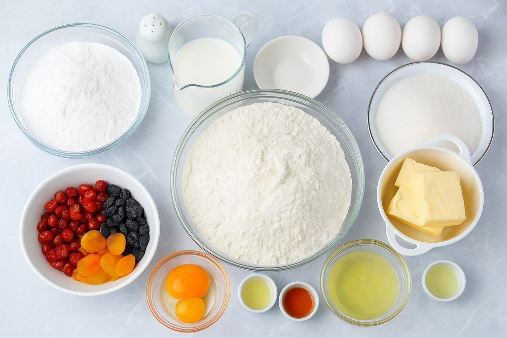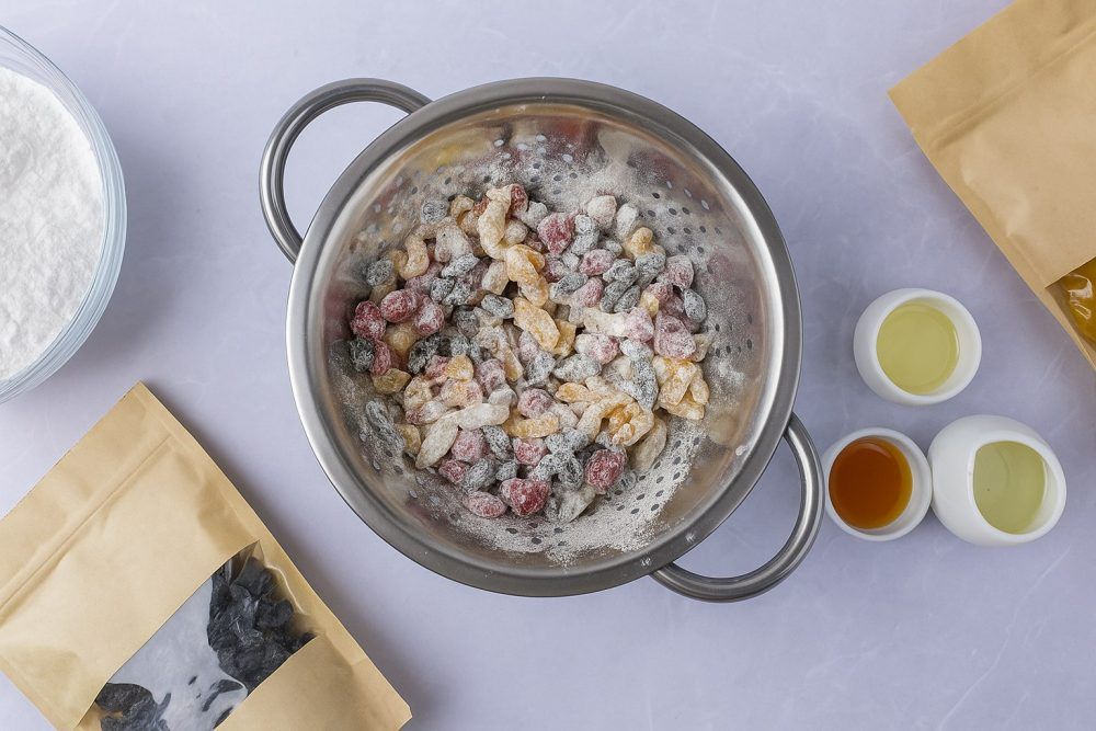 Для начала заранее подготовьте все ингредиенты, чтобы они согрелись до комнатной температуры. Изюм и курагу залейте горячей водой на 8–10 минут, затем промойте их под проточной водой и тщательно обсушите полотенцем. Курагу порежьте небольшими кусочками. Сухофрукты пересыпьте в дуршлаг, припылите мукой и аккуратно перемешайте — это поможет им не оседать в тесте. Остатки муки стряхните.