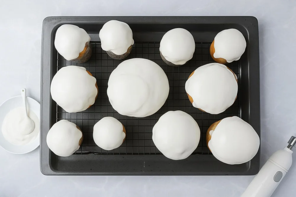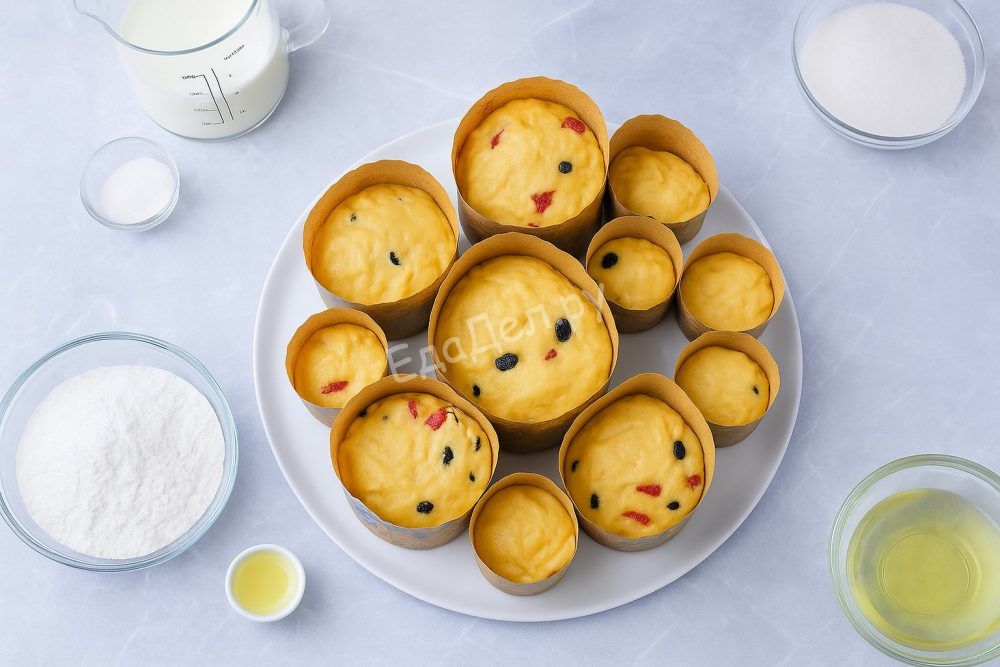 Форму заполняйте тестом только наполовину, чтобы куличи могли свободно подниматься. Накройте формы пищевой плёнкой и ещё раз уберите в тепло на 1 час. Выпекайте в разогретой до 180°C духовке 20 минут, затем уменьшите температуру до 160°C, накройте фольгой верх и допекайте ещё 40 минут. После выключения духового шкафа оставьте куличи там с приоткрытой дверцей на 20–30 минут. Затем переложите готовую выпечку на решётку и дайте полностью остыть под полотенцем.