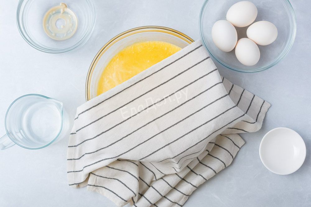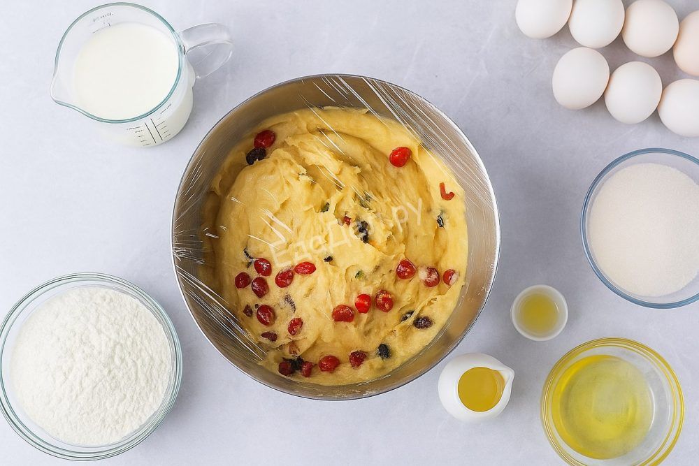 Глубокую миску смажьте растительным маслом и выложите туда тесто. Закройте пищевой плёнкой, также смазанной маслом и с несколькими проколами. Оставьте тесто подходить в тёплом месте примерно на полтора часа. Когда тесто увеличится вдвое, аккуратно обомните его, разделите на несколько частей по количеству форм и скатайте из них шары. Выложите заготовки в промасленные и присыпанные мукой формы.