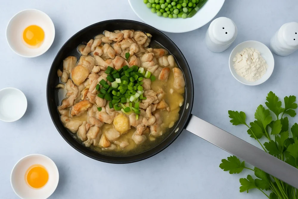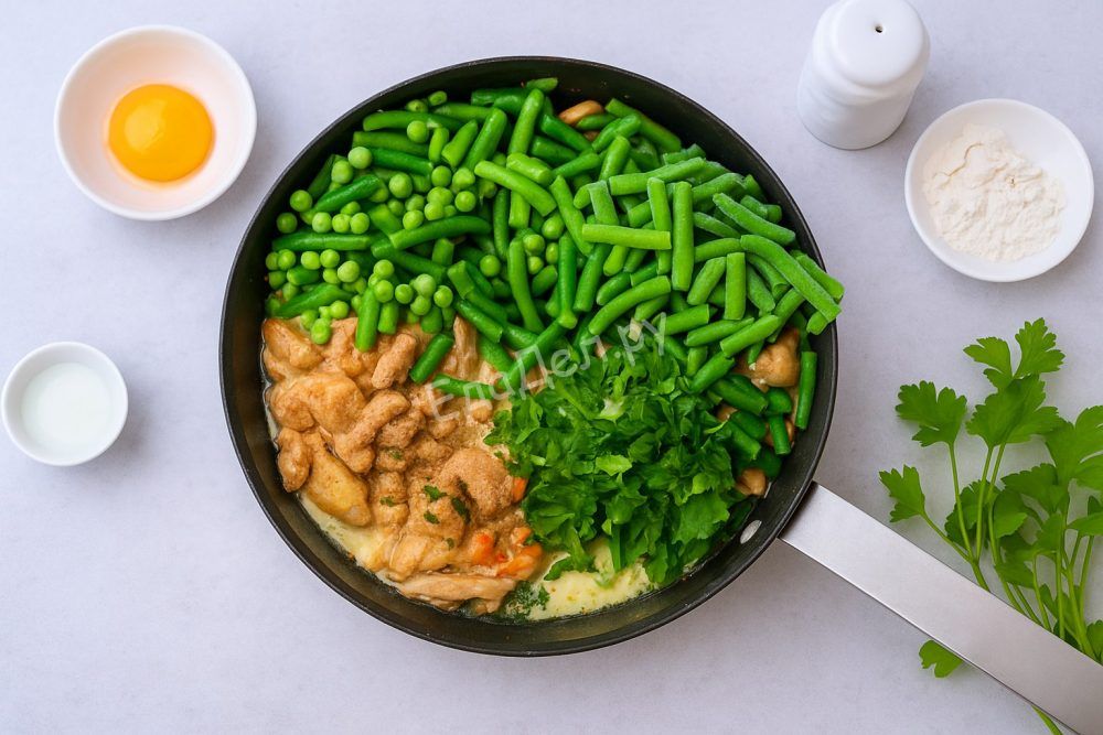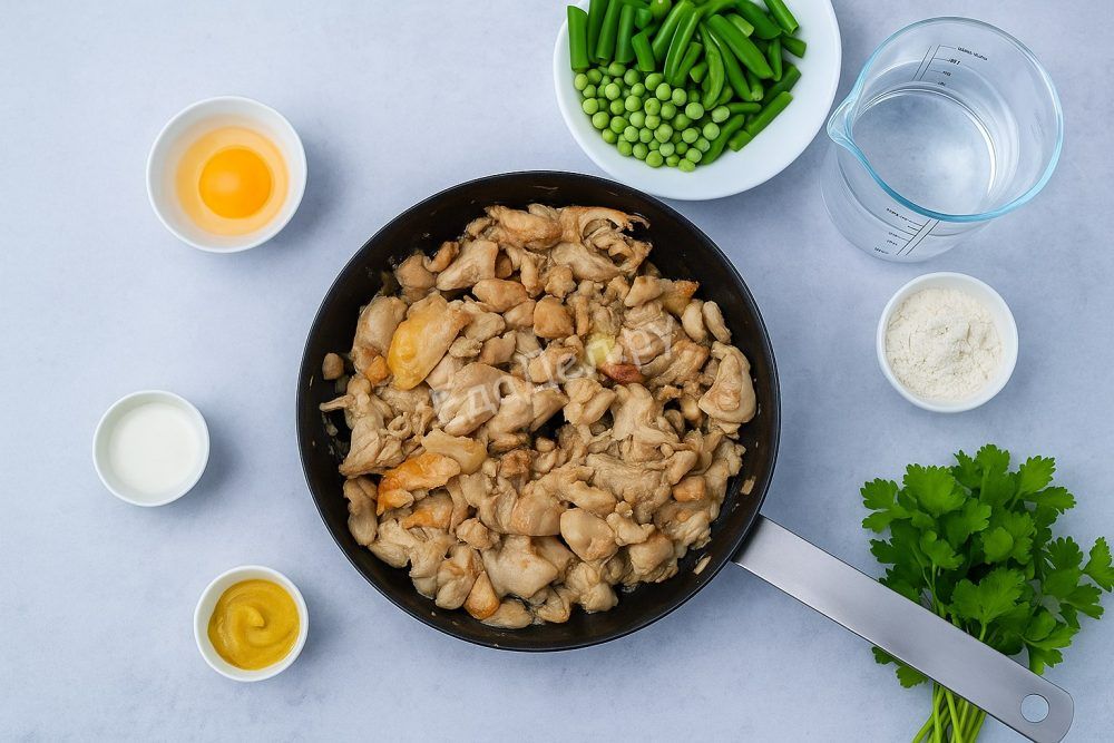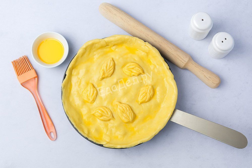 Поверхность рабочего стола обильно присыпьте мукой. Аккуратно раскатайте тесто в круг диаметром примерно 27 см и осторожно накройте им начинку в сковороде, плотно прижимая края. Смешайте яичный желток с водой и смажьте поверхность теста — это добавит пирогу красивый блеск. Выпекайте в заранее прогретой до 180 градусов духовке 20-25 минут до румяной корочки.