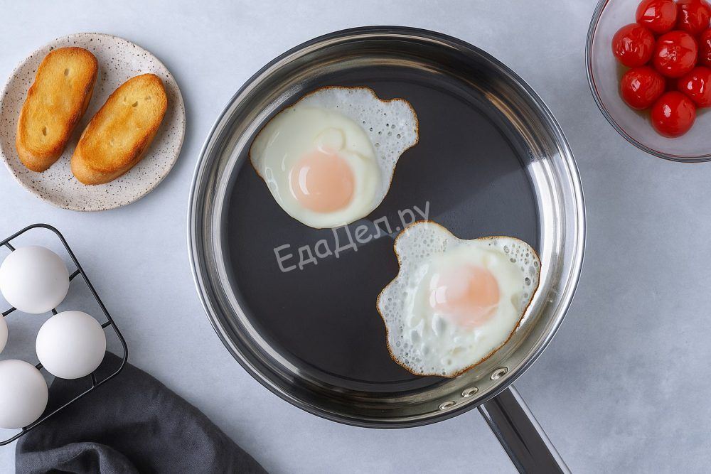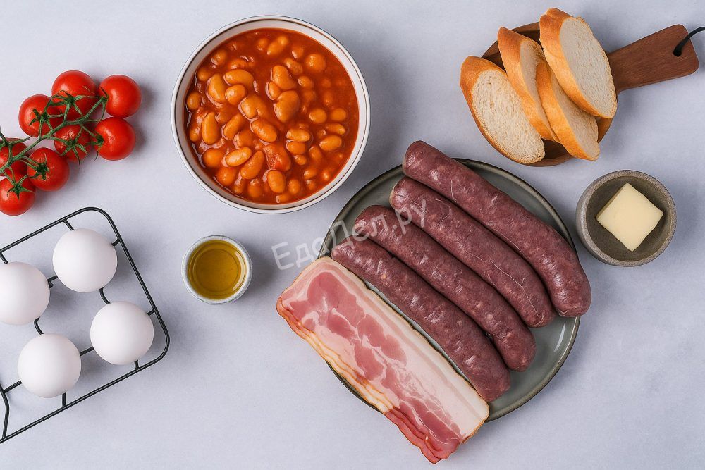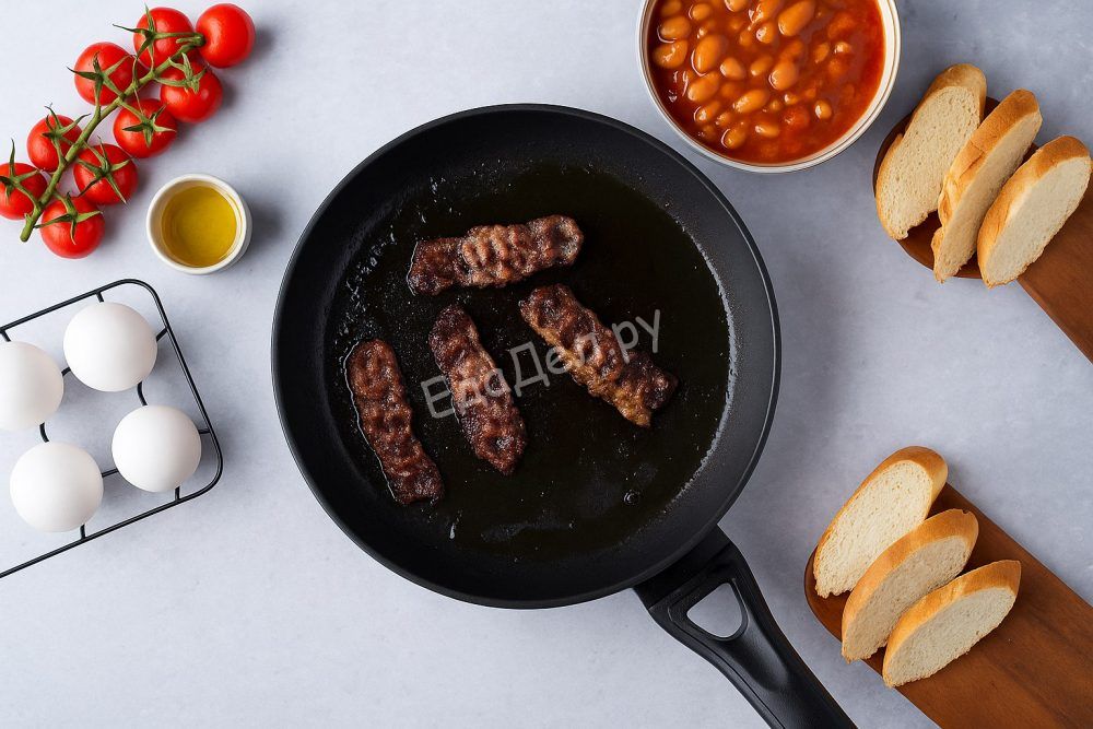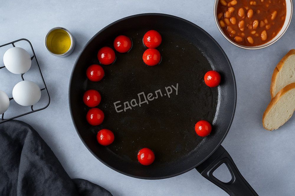 Налейте немного оливкового масла в разогретую сковороду на сильном огне. Разбейте туда яйца, стараясь не повредить желтки. Убавьте огонь до среднего, чуть посолите и жарьте 2-3 минуты, пока белок полностью не схватится. Для подачи разложите по тарелкам яичницу, колбаски, бекон, фасоль, тосты и помидоры черри, чтобы завтрак был настоящим английским!