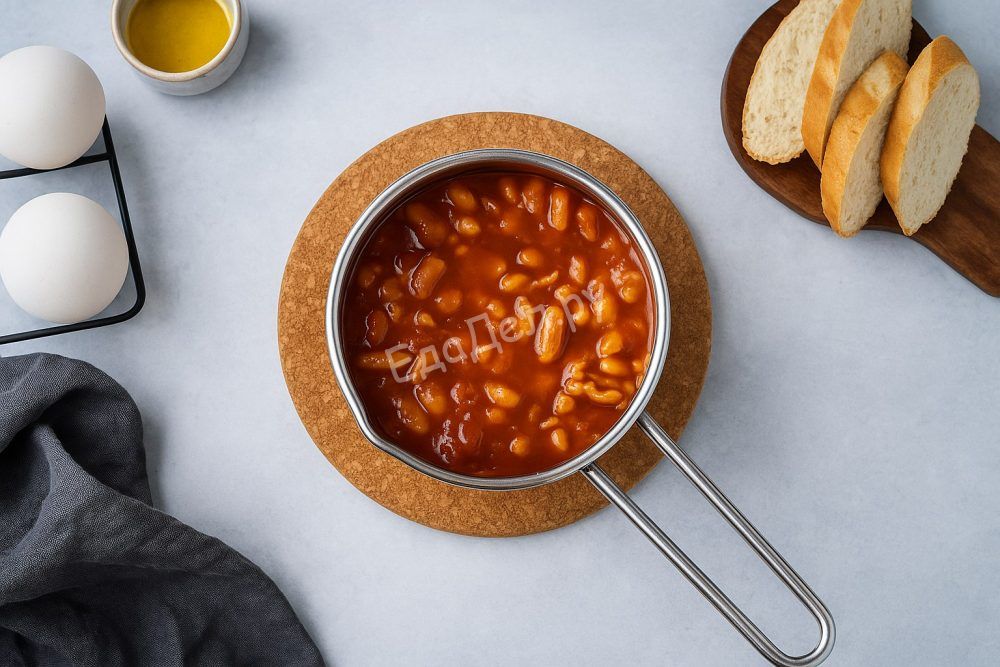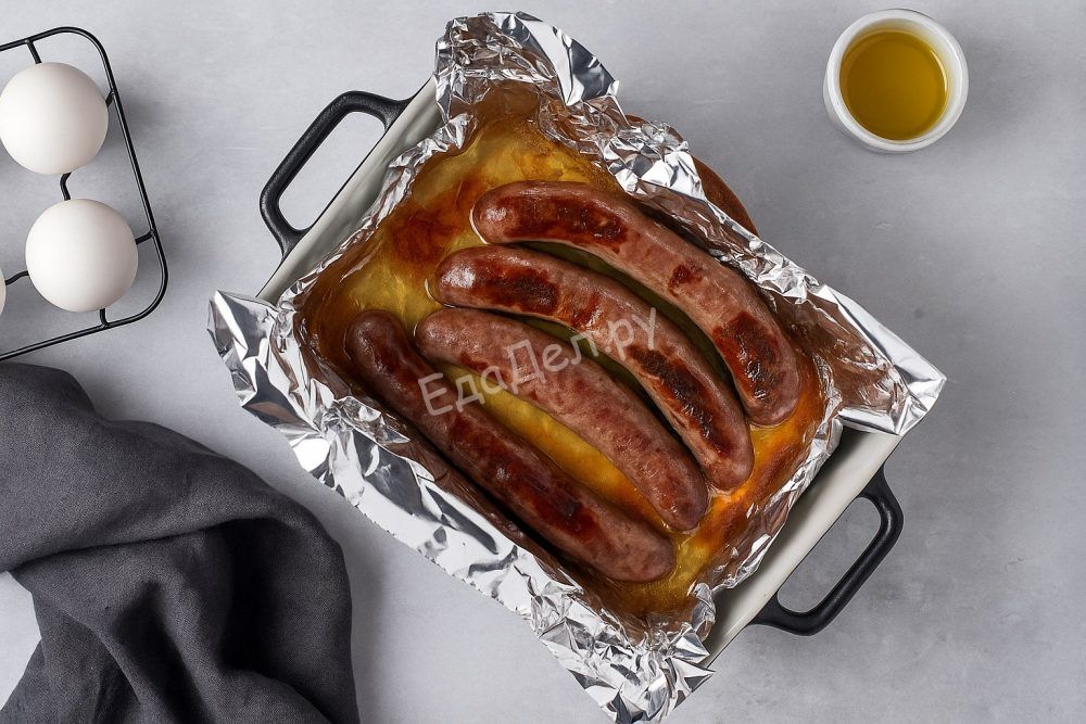 Пока колбаски запекаются, разогрейте сухую сковороду. Выложите на неё полоски бекона и добавьте 2-3 столовые ложки воды — это поможет вытопить жир, а бекон получится мягким. После выпаривания жидкости уменьшите огонь и обжаривайте, переворачивая до хрустящей корочки. Готовый бекон переложите на бумажные полотенца и накройте крышкой, чтобы он оставался тёплым.