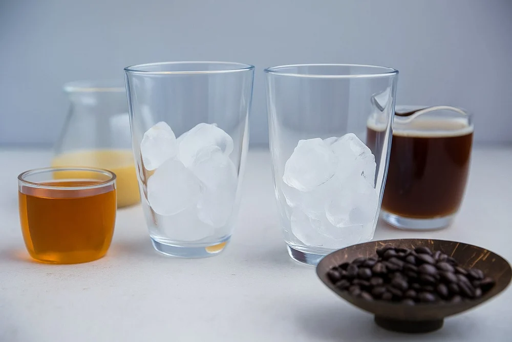 Заранее подготовьте два прозрачных бокала объёмом около 300 мл — для яркого эффекта лучше использовать стеклянные стаканы. Охладите их в холодильнике или наполните кубиками льда минут на 5 перед началом приготовления. Засыпьте по 6–7 кубиков льда в каждый бокал — так кофе останется холодным и будет дольше держать свои красивые слои.