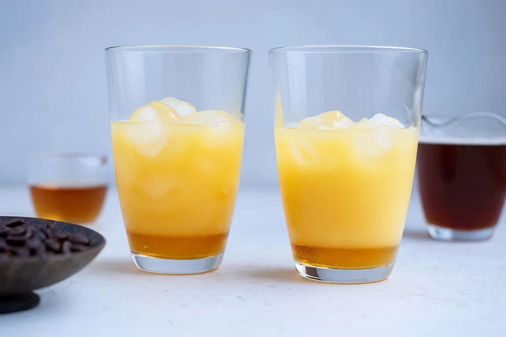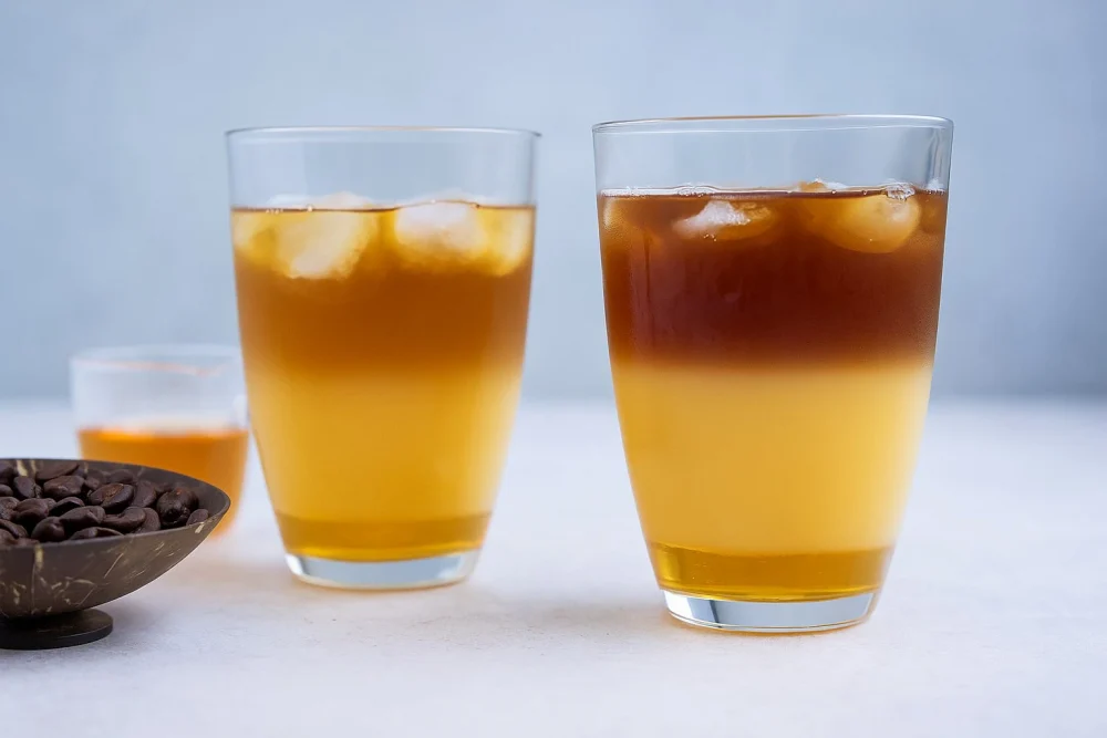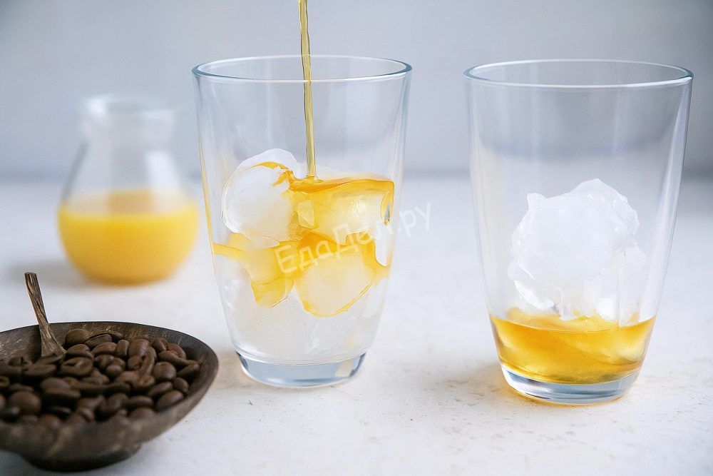 Приготовьте эспрессо любым удобным для вас способом — на кофемашине, во френч-прессе или турке. Горячий кофе дайте постоять пару минут, чтобы он немного остыл и не растопил лёд мгновенно. Затем аккуратно влейте по 50 мл кофе в каждый бокал, используя ложку для слоя — так получится чёткое трёхслойное разделение. Подавайте сразу, затем напиток можно перемешать по вкусу.
