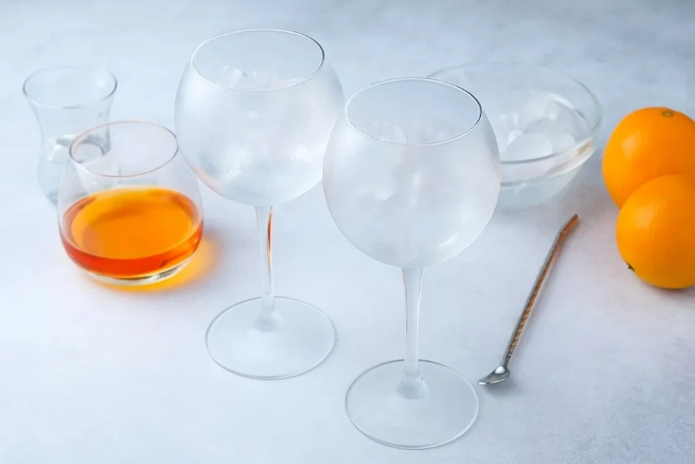 Возьмите два крупных бокала и охладите их заранее, чтобы коктейль оставался холодным дольше. Затем положите в каждый бокал несколько кубиков льда, наполняя примерно на половину.
