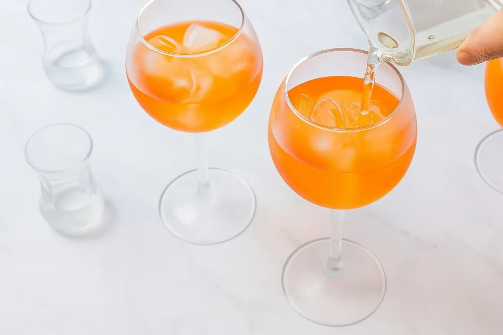 Аккуратно влейте в каждый бокал порцию апероля (около половины бокала, крепостью 11%), затем добавьте сухое шампанское или игристое вино. Для более мягкого вкуса можно выбрать полусладкое или классический итальянский просекко.