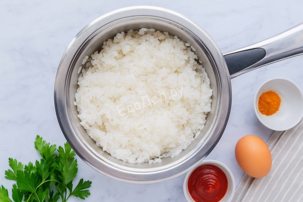 Промойте рис несколько раз в холодной воде, пока вода не станет прозрачной — это поможет избавиться от лишнего крахмала и рис получится рассыпчатым. Выложите рис в сотейник, залейте водой в пропорции 1:1,5, поставьте на сильный огонь и доведите до кипения. Затем убавьте огонь, накройте крышкой и оставьте вариться на минимальном огне 15 минут, не открывая крышку и не перемешивая.