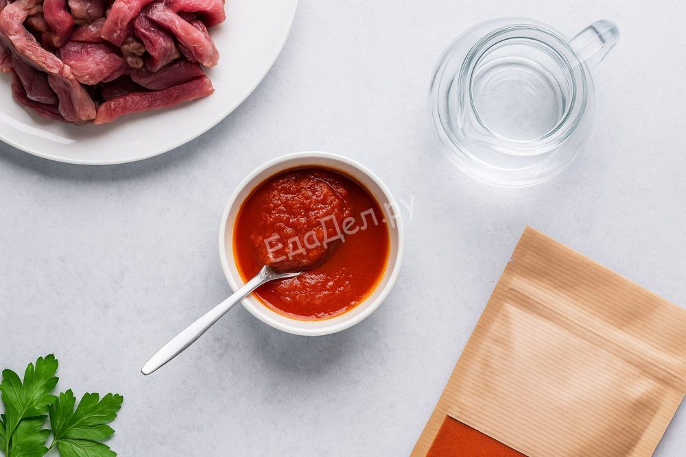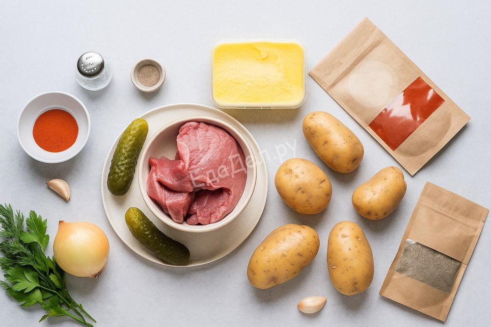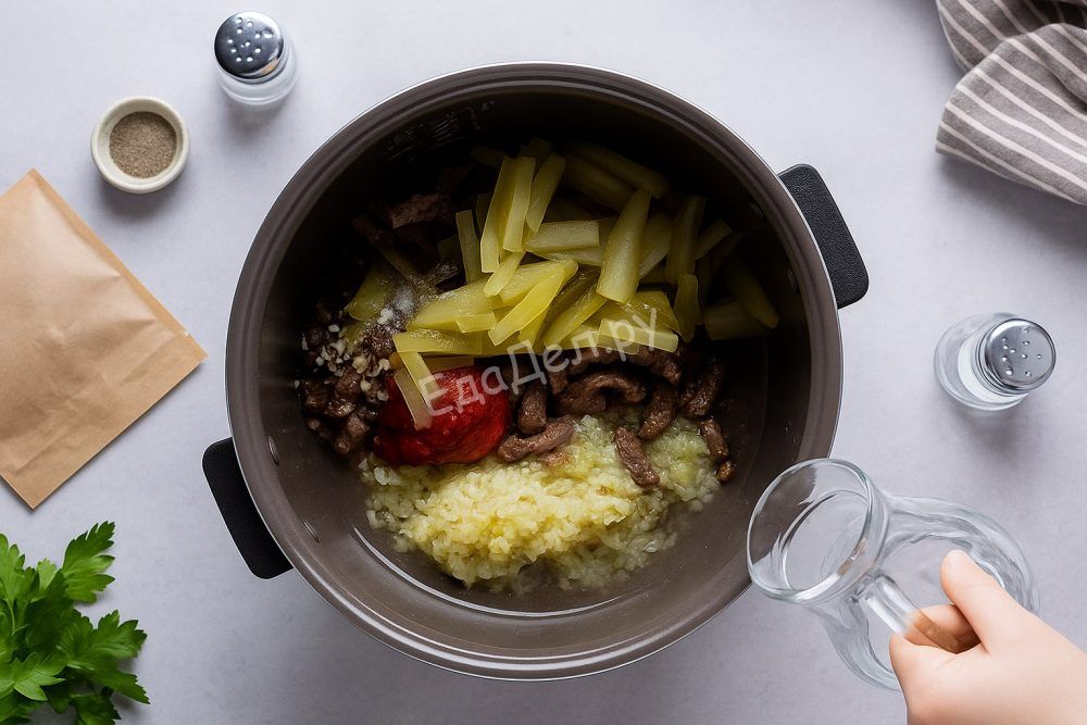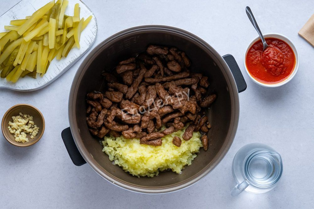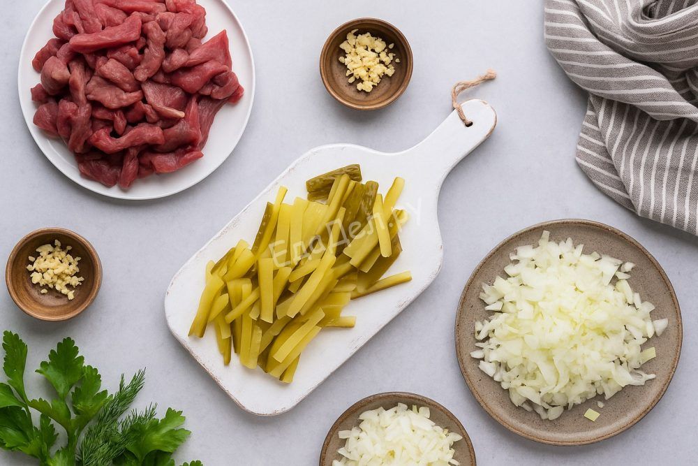 Обсушите мясо с помощью бумажного полотенца, чтобы оно хорошо обжаривалось и не выделяло лишнюю влагу. Нарежьте мясо ровными полосками примерно 1 см шириной и 5 см длиной — такой размер оптимален для тушения. Лук и чеснок мелко порубите, солёные огурцы нарежьте тонкой соломкой. Если кожура огурца слишком жёсткая, её лучше снять.
