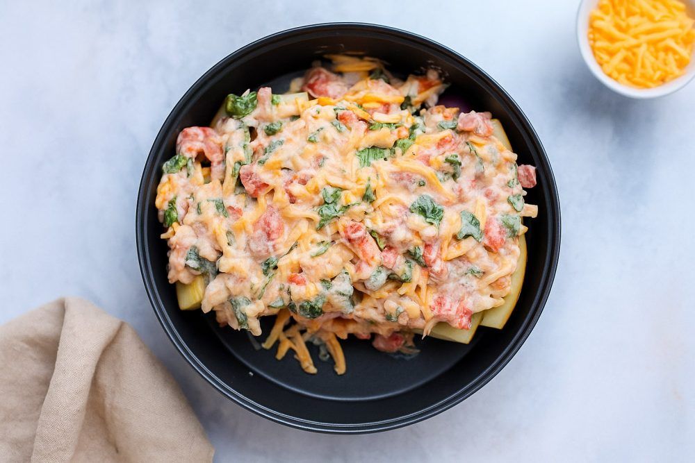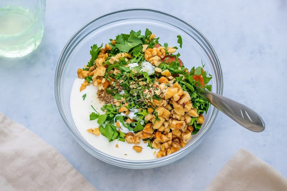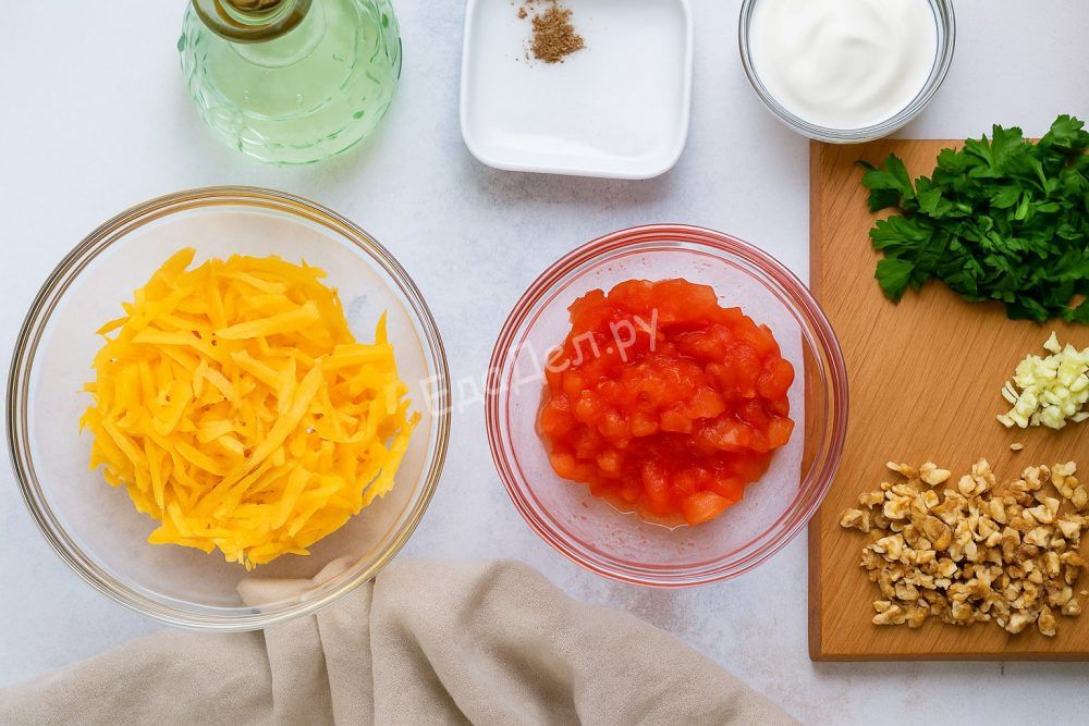 Тем временем натрите сыр на средней тёрке и высыпьте в большую миску. Добавьте нарезанные помидоры, измельчённый чеснок, свежую петрушку и сметану. Посолите, поперчите, всё тщательно перемешайте до однородности. Для более выраженного вкуса чеснок можно поколотить плоской стороной ножа и мелко нарубить, а орехи измельчить в небольшую крошку.