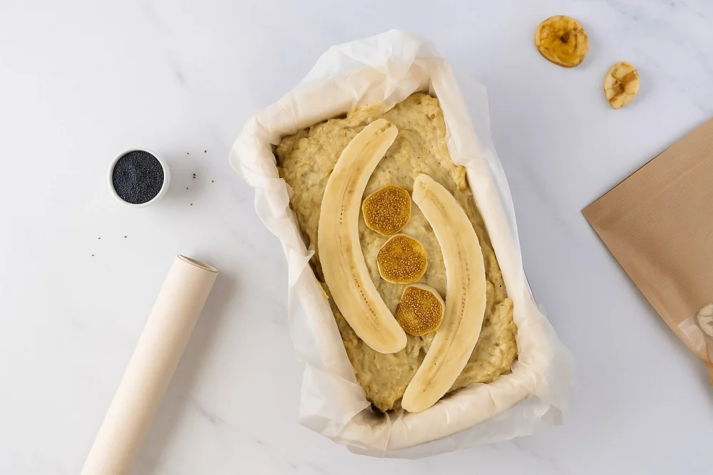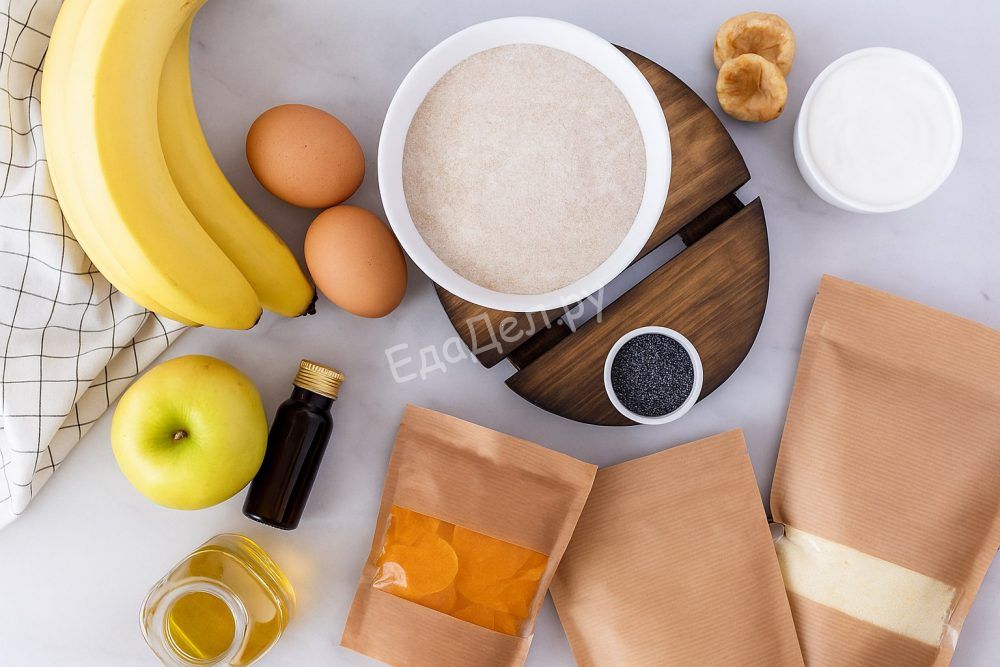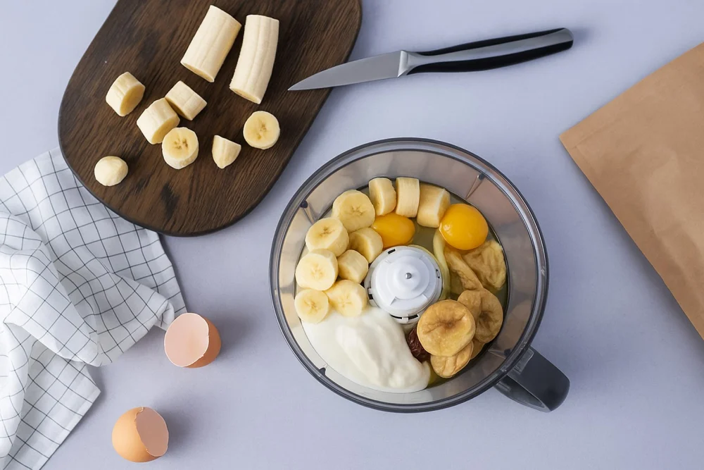 В чашу кухонного комбайна поместите 200 г инжира, мягкое сливочное масло, густой йогурт, очищенные и нарезанные бананы, ванильный экстракт и яйца. Взбейте до полной однородности — это обеспечит насыщенную вкусом, влажную основу. Инжир можно заменить на курагу или финики, если вы разнообразите рецепт.