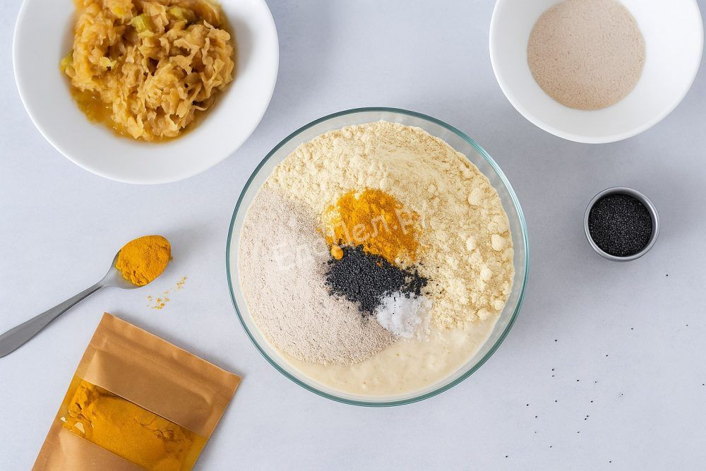 Переложите бананово-инжирную массу в глубокую миску. Добавьте просеянную пшеничную и миндальную муку, разрыхлитель теста, мак и куркуму — эти компоненты придают хлебу особую структуру и цвет. Яблоко натрите на крупной тёрке (предварительно очистив от кожуры и сердцевины) и вмешайте в тесто для приятной кислинки и дополнительной сочности.