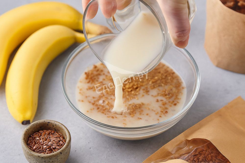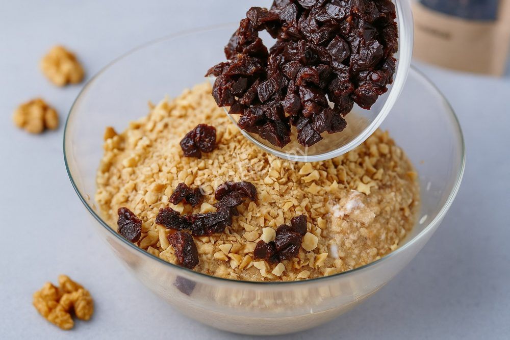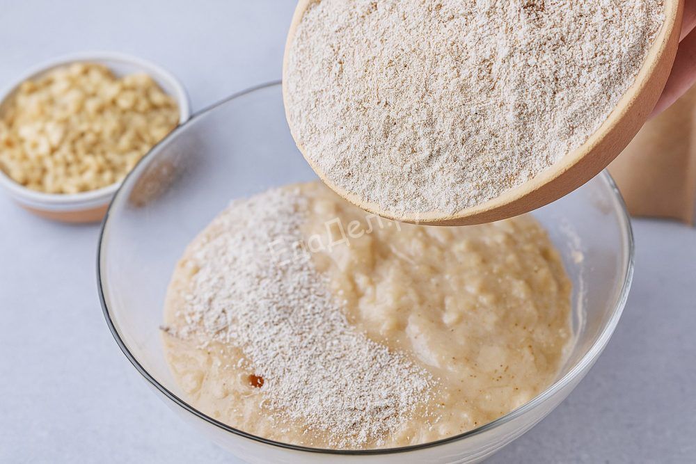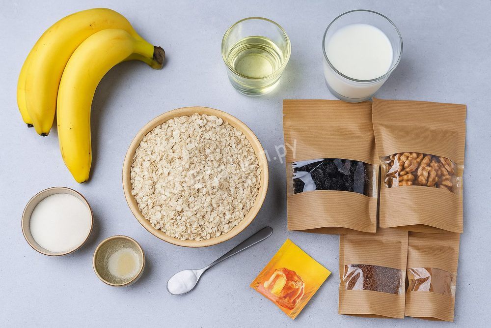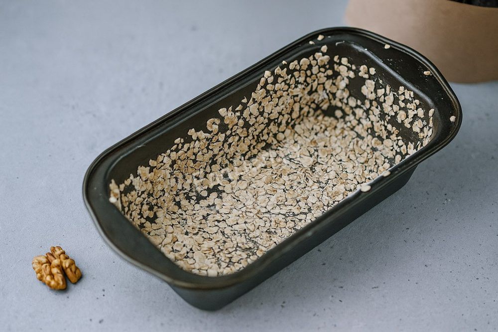 Смажьте стандартную форму для выпечки маслом и присыпьте её овсяными хлопьями для дополнительной текстуры и вкуса. Переложите тесто, разровняйте верх ложкой или лопаткой. Выпекайте в предварительно разогретой духовке при 200°C около 55–60 минут. Проверяйте готовность кекса деревянной шпажкой — она должна выходить чистой.