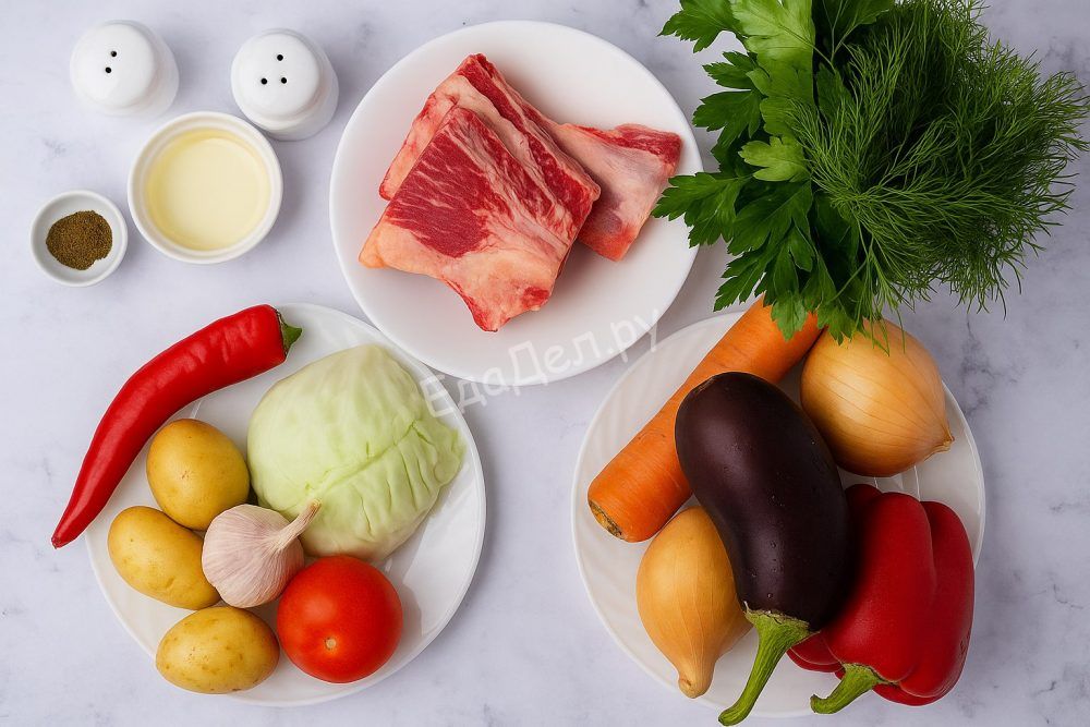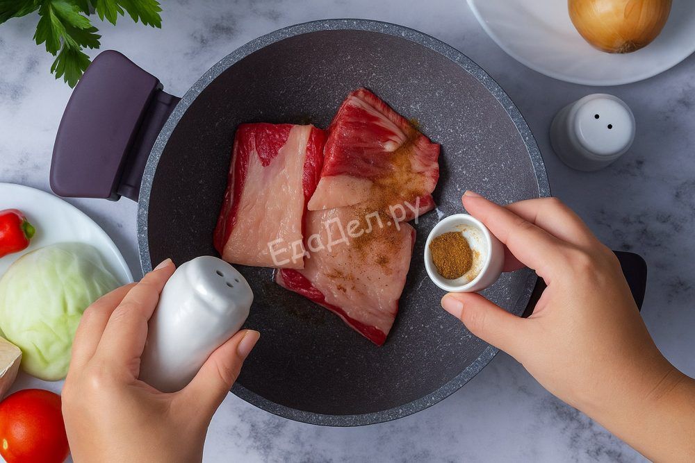 Понадобится казан объёмом около 3 литров. Курдючный жир нарежьте небольшими кубиками и уложите на дно — он прекрасно напитывает блюдо ароматом и сочностью, но если жира нет, можно заменить его подсолнечным маслом. Затем равномерно распределите говяжьи рёбра. Обильно приправьте солью, свежемолотым чёрным перцем, присыпьте зирой и кориандром — эти специи придадут особый восточный колорит.