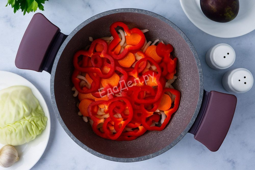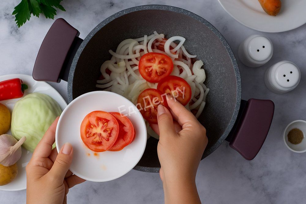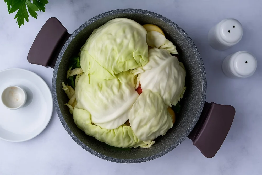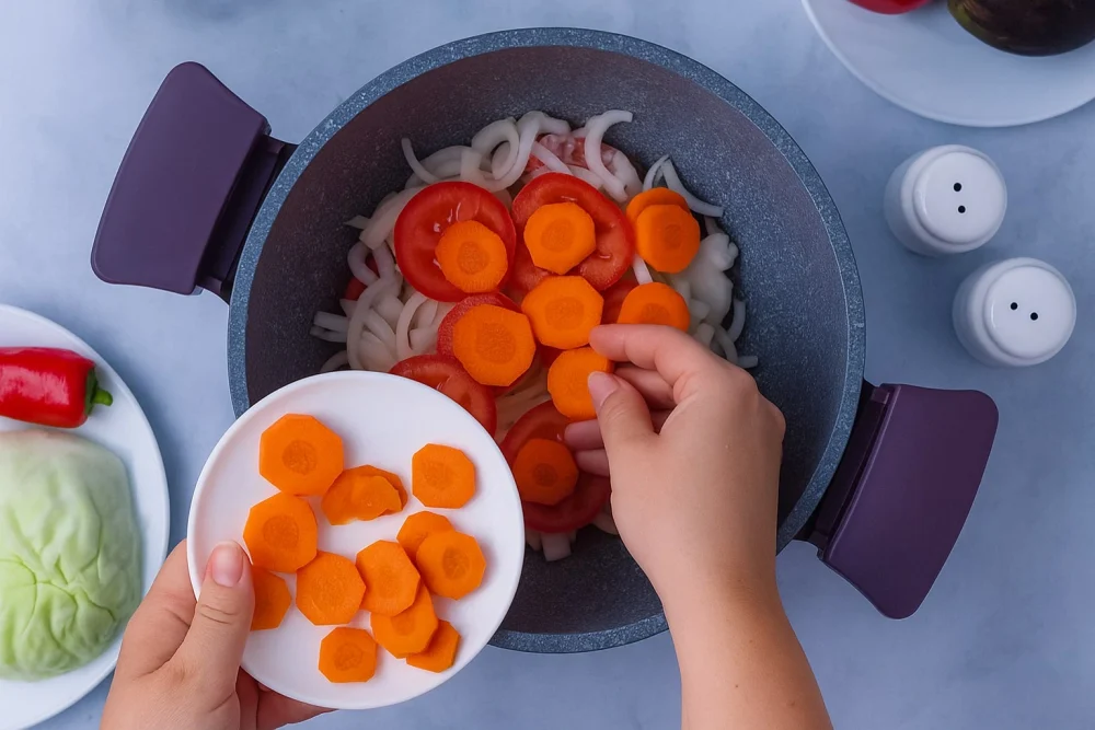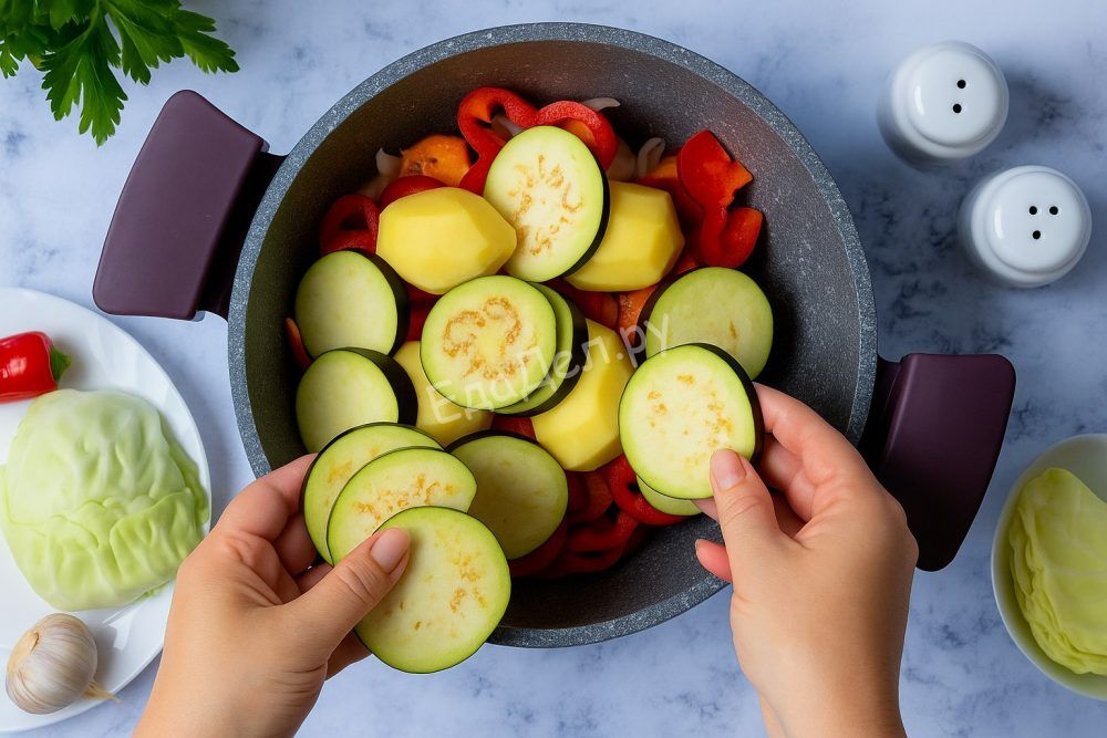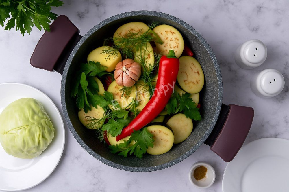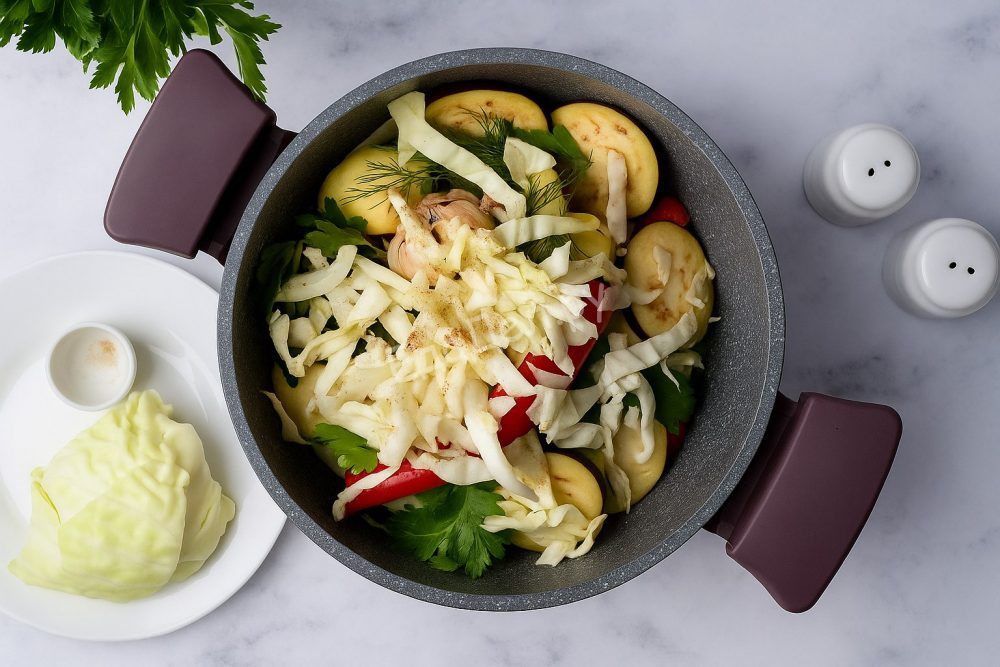 Сверху накройте пластом капустных листьев — они удержат пар внутри, помогая всем слоям пропитаться соками. Плотно закройте казан крышкой, поставьте на сильный огонь на 15 минут для разогрева, затем убавьте до минимума и томите 1,5–2 часа. Не открывайте казан во время приготовления — все овощи и мясо должны томиться в собственном соку.