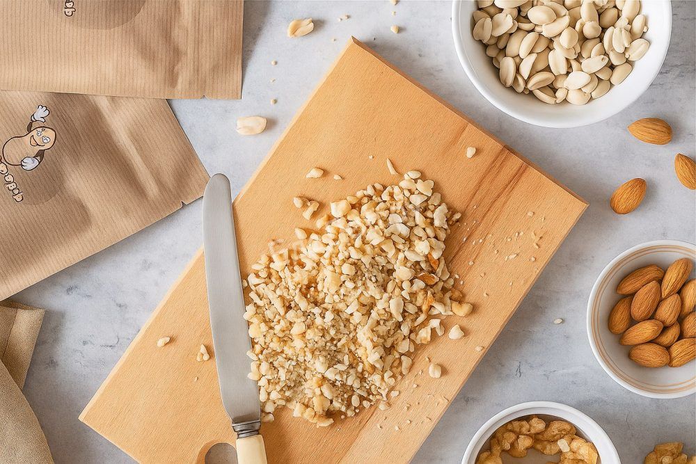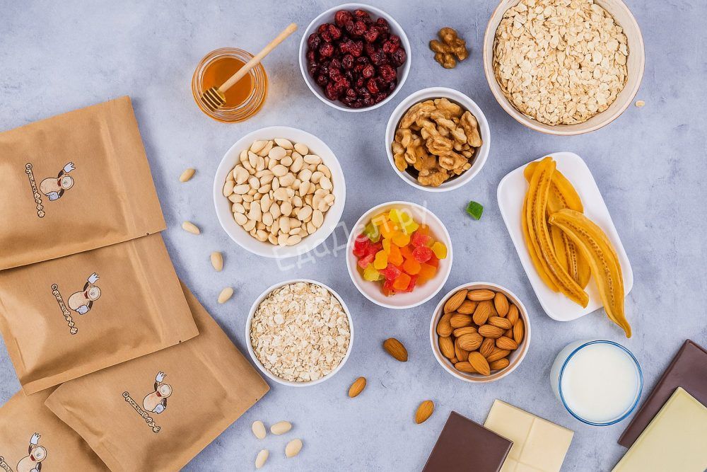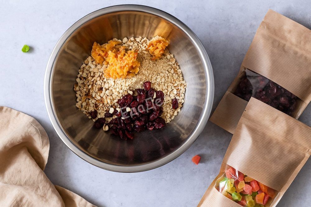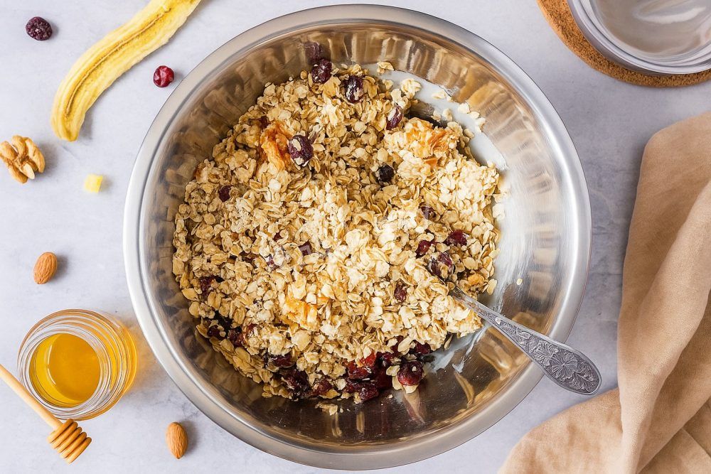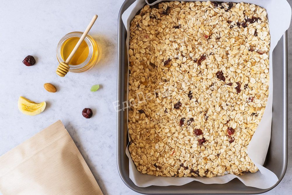 Полученную массу выложите на противень, застеленный пергаментом, или в подходящую прямоугольную форму, предварительно смазав её сливочным маслом. Разровняйте ложкой или силиконовой лопаткой, чтобы толщина была примерно одинаковой — так батончики пропекутся равномерно. Запекайте при 180°C около 20–25 минут до появления ровной золотистой корочки. Дайте немного остыть и аккуратно переверните пласт.
