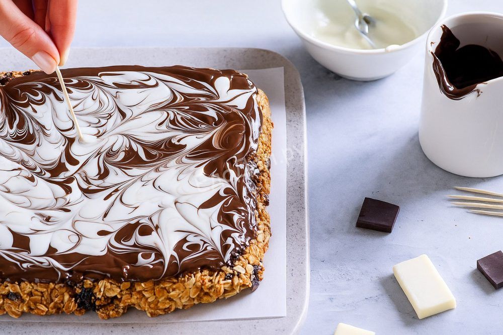 Украсьте овсяный пласт, полив сперва тёмным, затем белым шоколадом, заранее растопив их на водяной бане или в микроволновке. Для декоративного эффекта проведите зубочисткой по поверхности, создавая узоры. Охладите заготовку в холодильнике минимум 1 час, чтобы шоколад застыл. Затем нарежьте батончик на порционные кусочки острым ножом.