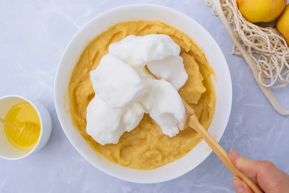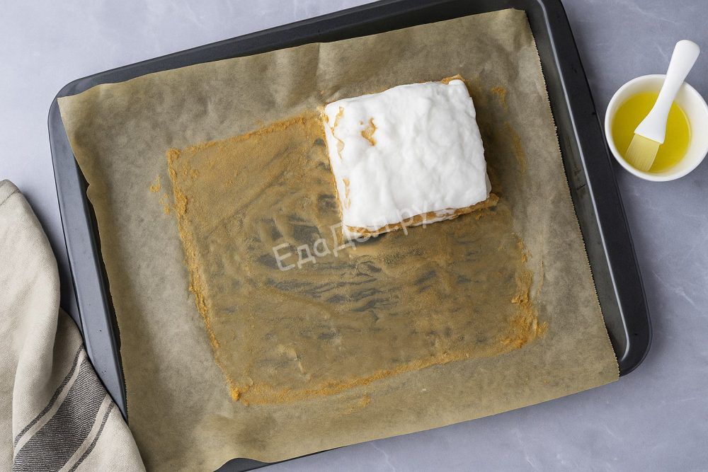 Дайте пласту пастилы остыть, затем аккуратно нарежьте его на 4 части. Смажьте каждый слой оставшимися взбитыми белками и сложите их друг на друга. Поместите снова в духовку ещё на 3 часа. Готовую пастилу можно слегка припудрить крахмалом либо сахарной пудрой, чтобы она не липла к рукам. Наслаждайтесь полезным десертом!