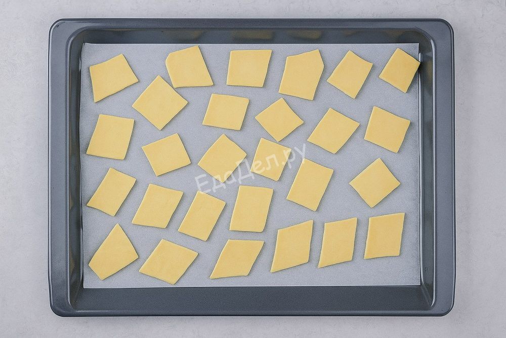 Раскатайте тесто в очень тонкий пласт на слегка присыпанной мукой поверхности. Острым ножом нарежьте широкие полосы, а затем разрежьте их на ромбы среднего размера. Разложите заготовки на противне с пергаментом и слегка подсушите в духовке при 120°C около 20 минут — оставьте дверцу духовки приоткрытой для выхода пара.