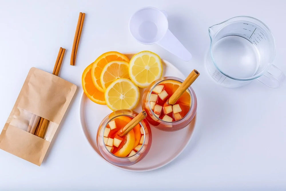 Перед подачей разлейте сангрию вместе с фруктами по бокалам, наполнив их примерно на 2/3. Добавьте охлаждённую негазированную воду по вкусу — напиток станет ещё более освежающим. По желанию подойдёт газированная вода или лимонад типа спрайта. Для украшения и лёгкого пряного аромата положите в каждый стакан палочку корицы.