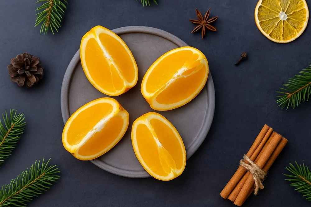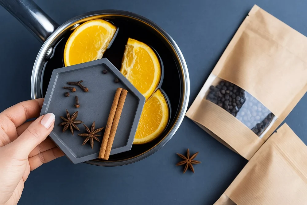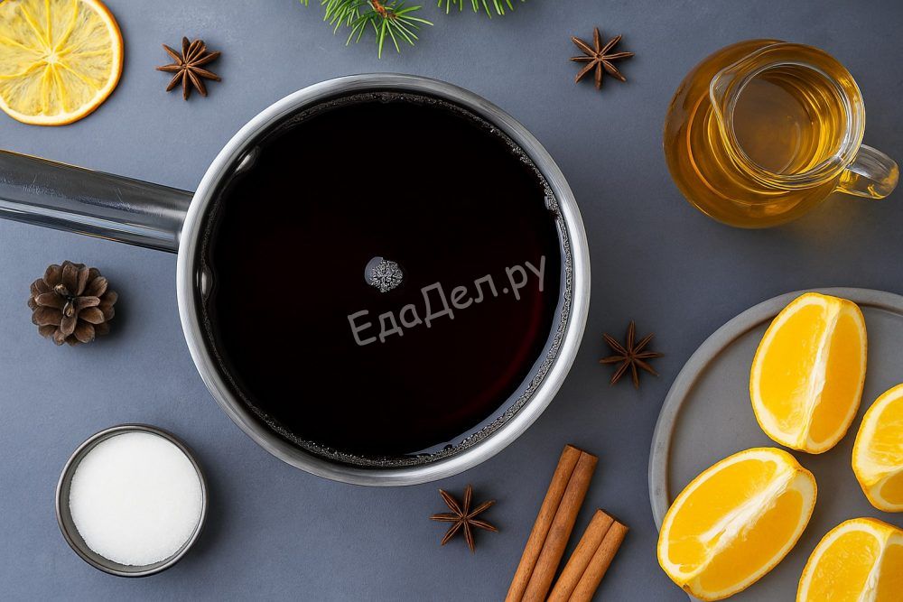Поставьте кастрюлю на слабый огонь. Выложите туда дольки апельсина, засыпьте сахар по вкусу и добавьте все выбранные специи. Две палочки корицы оставьте для украшения бокалов при подаче. Осторожно доведите напиток до кипения, не давая ему сильно бурлить, чтобы сохранить насыщенность вкусов и ароматов.
