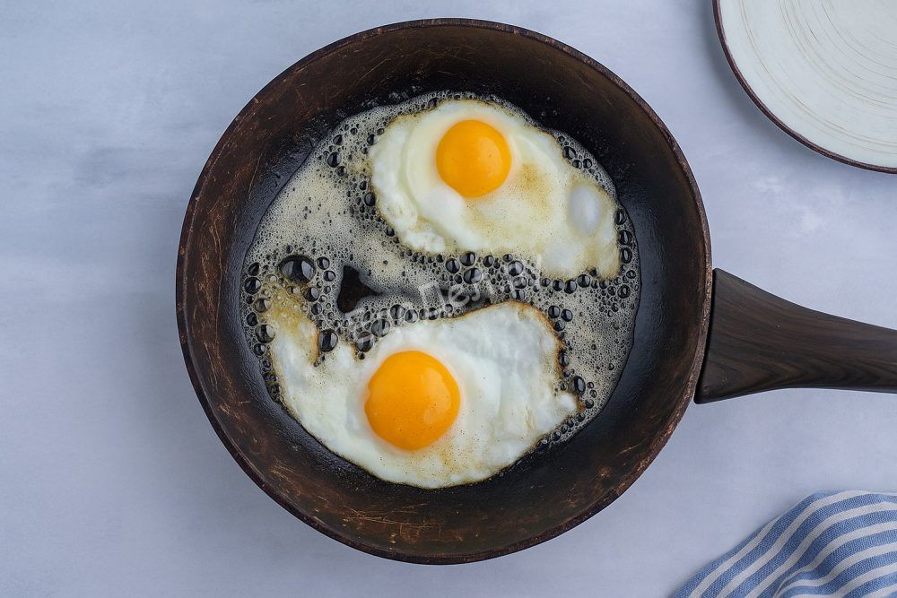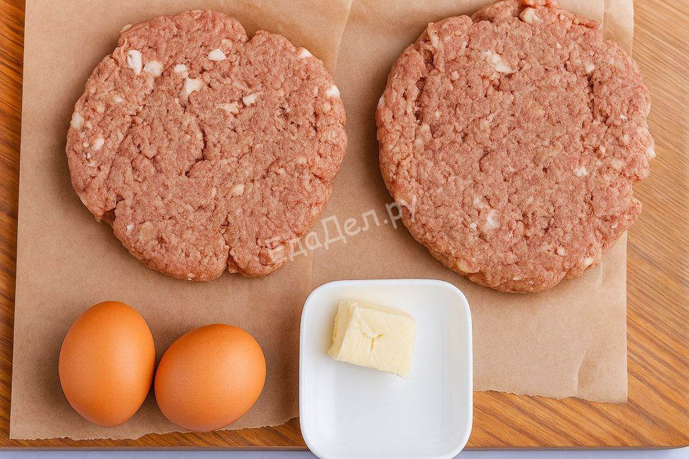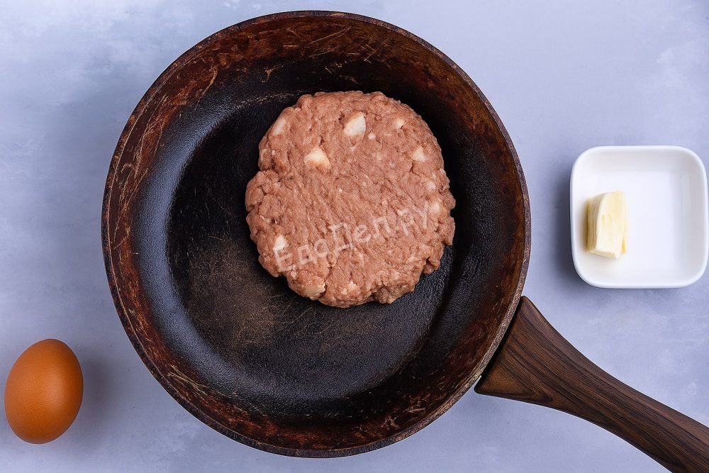 Готовые бифштексы выложите на теплый противень в духовку. В это время на той же сковороде растопите сливочное масло и приготовьте две аккуратные яичницы-глазуньи, слегка присолив и поперчив. Для подачи уложите листья салата на тарелку, сверху разместите бифштексы, а на них — яичницу. Подавайте горячим!