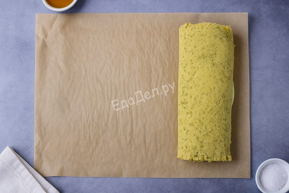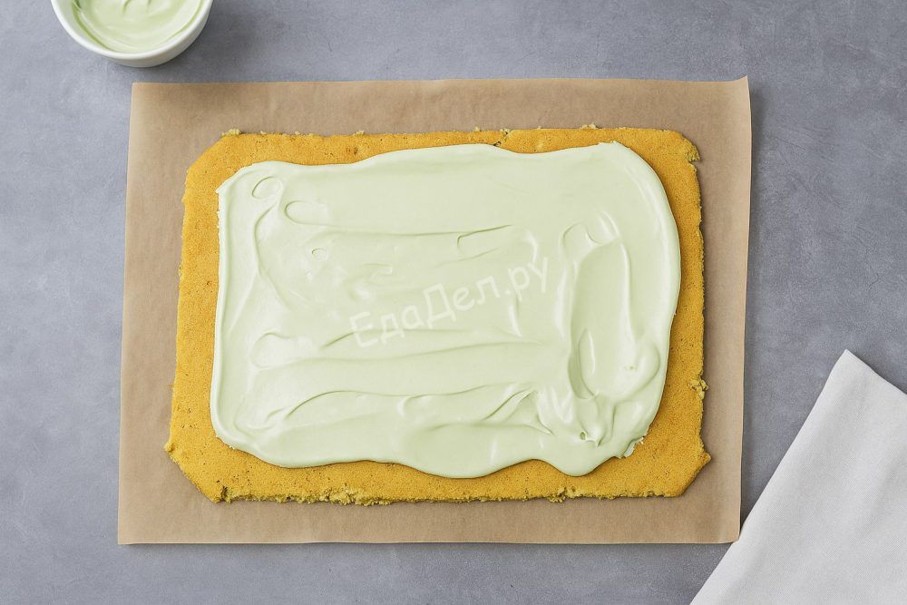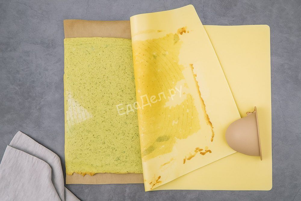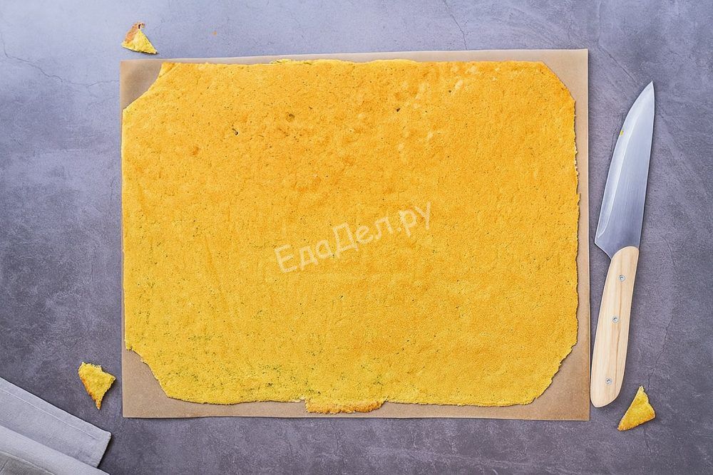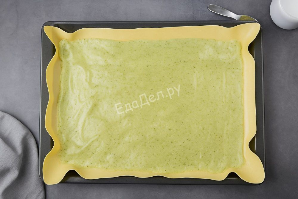 Противень размером 38×25 см застелите силиконовым ковриком или бумагой для выпечки. Выложите тесто и разровняйте его лопаткой или ложкой в ровный слой. Немного потрясите или слегка постучите противнем по столу для выхода пузырьков воздуха. Выпекайте в разогретой до 190°C духовке 10–12 минут. Проверьте готовность шпажкой — она должна выйти сухой.