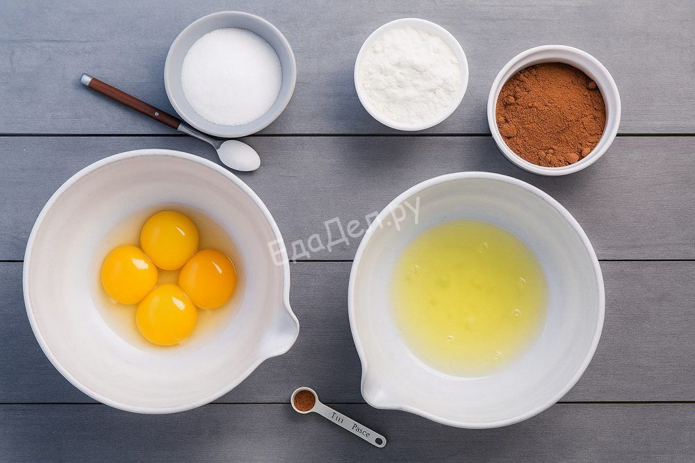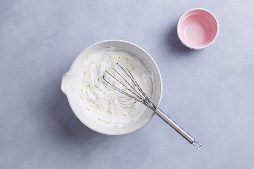 Начните с аккуратного отделения белков от желтков. Взбейте белки миксером до образования мягких пиков — так масса получится лёгкой и воздушной. В отдельной миске тщательно разотрите желтки с сахаром до светлой и пышной консистенции, затем влейте ванильный экстракт для насыщенного аромата, хорошо перемешайте.