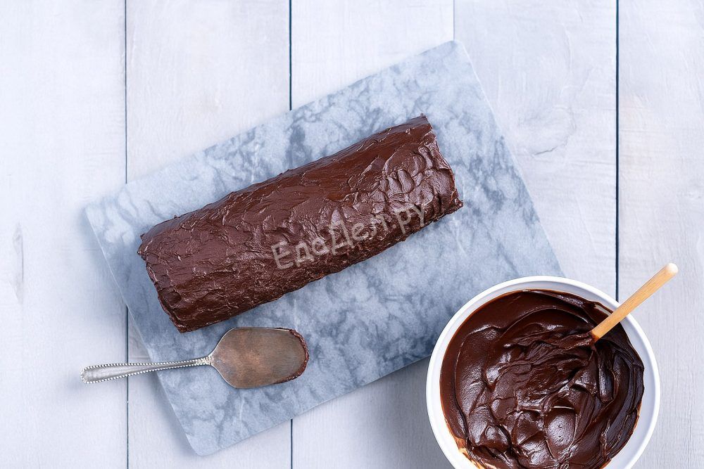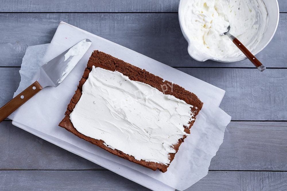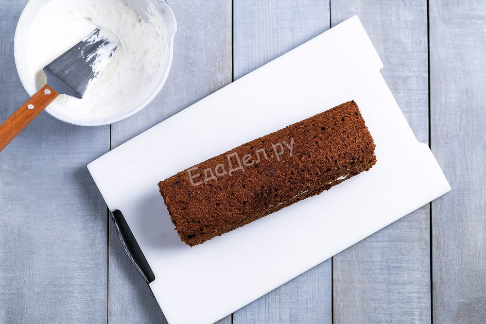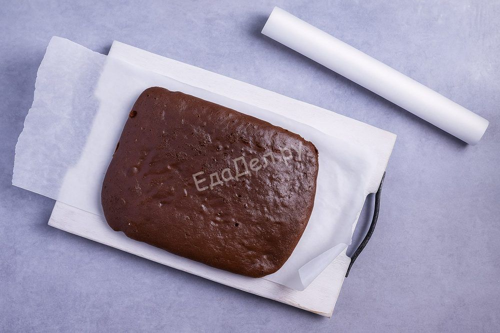 Противень размером примерно 20×30 см застелите бумагой для выпечки или силиконовым ковриком. Выложите тесто и распределите ровно по поверхности лопаткой. Выпекайте в разогретой до 180°C духовке около 10-12 минут. Готовность проверьте зубочисткой: она должна выходить сухой. Достаньте противень, на горячий бисквит положите новый лист бумаги. Переверните корж, аккуратно снимите бумагу или коврик. Если нужно, помогите себе лопаткой или ножом. Сверху положите ещё бумагу и вновь переверните бисквит румяной стороной наверх. Обрежьте край наискосок для аккуратности. Потом сверните корж вместе с бумагой и оставьте на решётке под полотенцем остыть.