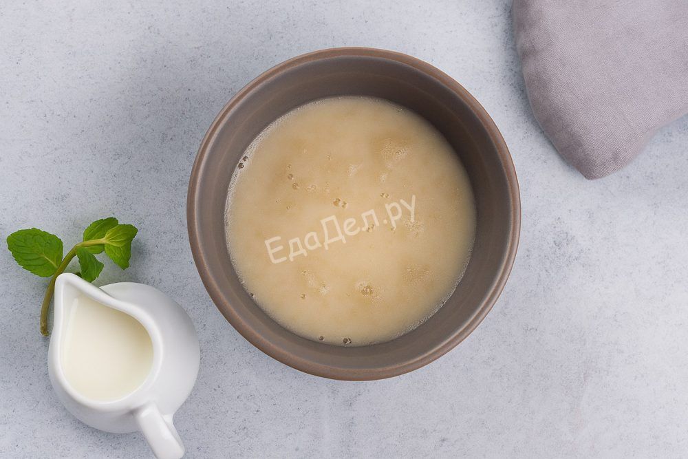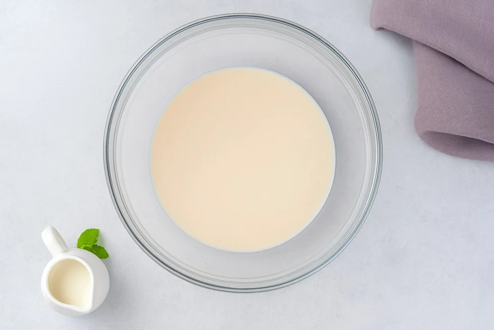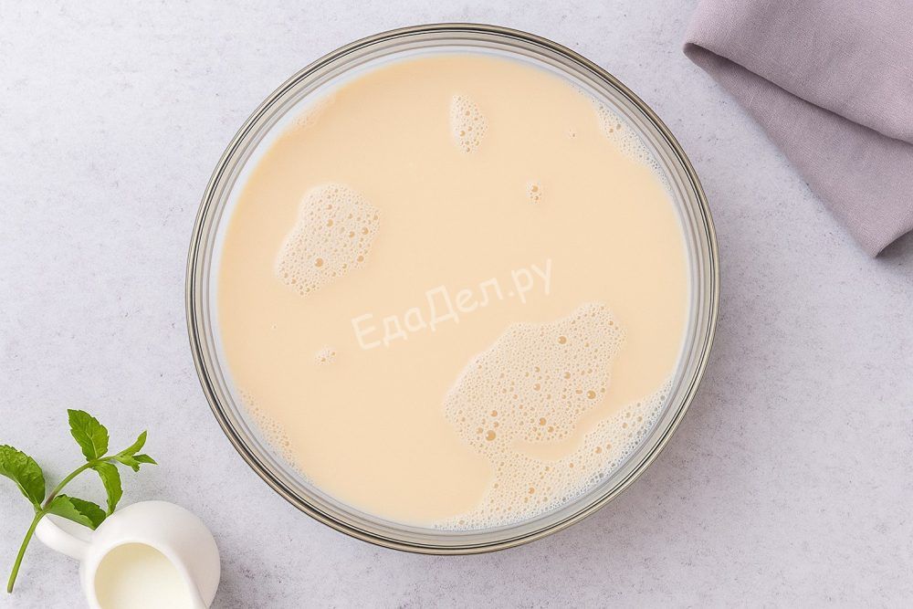 Для десерта можно использовать как быстрорастворимый, так и обычный пищевой желатин. Выложите его в небольшую ёмкость, залейте 50 мл холодного молока и оставьте для набухания на 8–15 минут — точное время зависит от размера и типа желатина. Советуем не спешить, чтобы желатин полностью растворился, тогда текстура будет идеально гладкой.