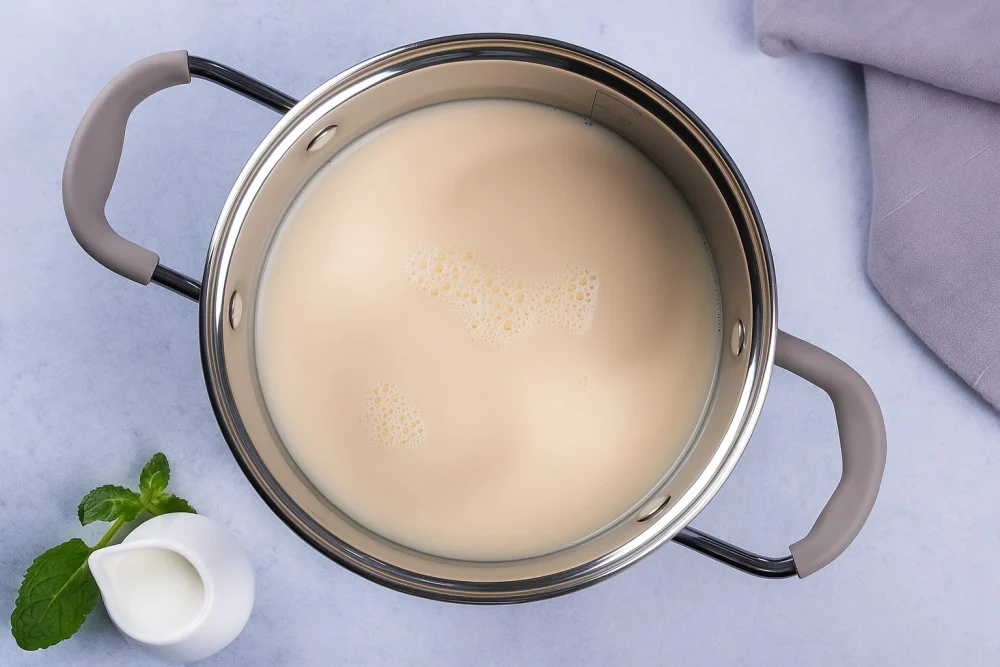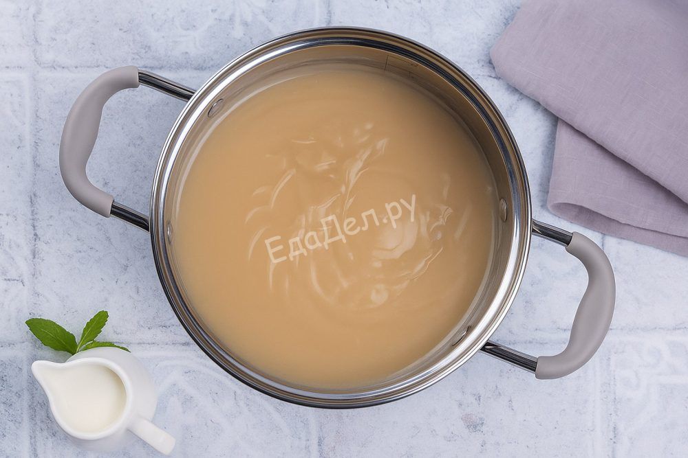Тем временем налейте в сотейник 800 мл молока и добавьте сахар. Поставьте на средний огонь и доведите до кипения, периодически помешивая, чтобы сахар полностью растворился. Можно взять молоко на ваш вкус — коровье или растительное, например, кокосовое или миндальное, чтобы придать десерту особую нотку.