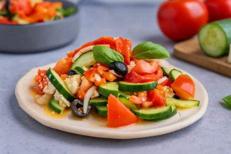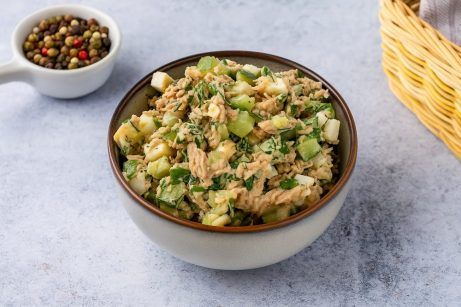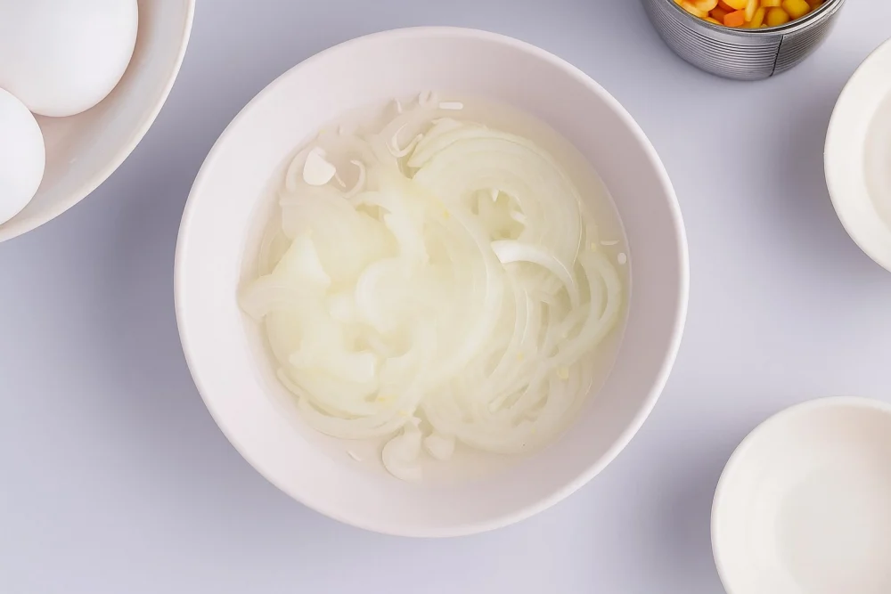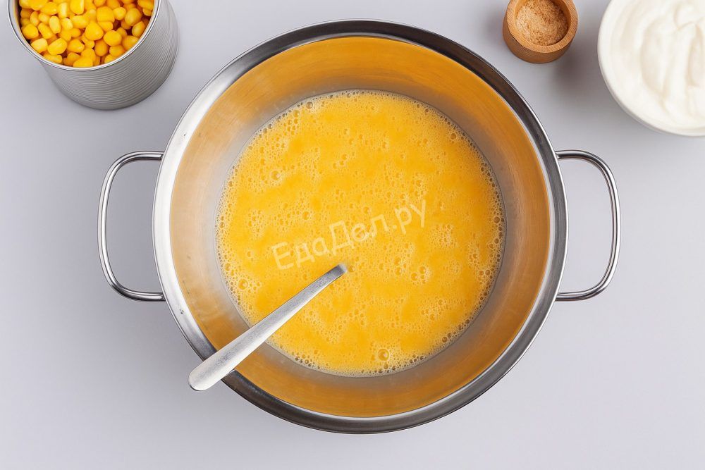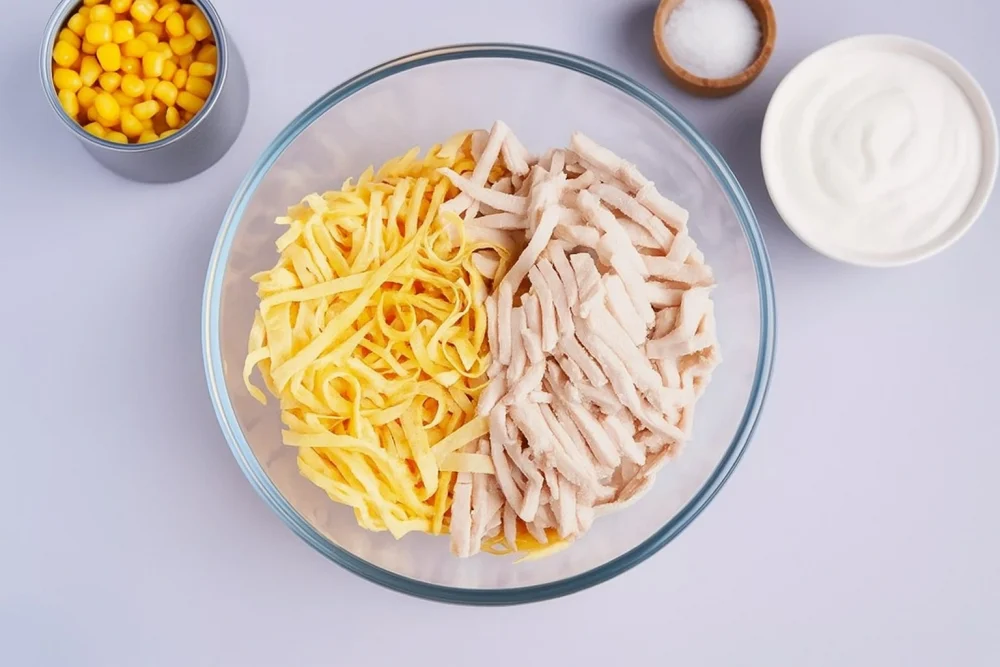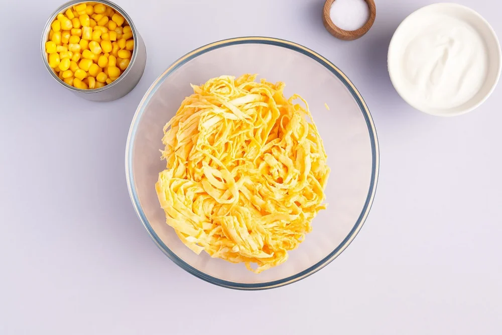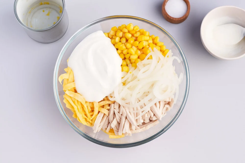 Маринованный лук аккуратно отожмите от лишней жидкости и, если нужно, промокните бумажным полотенцем. Добавьте в миску с остальными ингредиентами. Засыпьте консервированную кукурузу, всё немного посолите по вкусу и заправьте сметаной. Перемешайте, подавайте и наслаждайтесь ярким и оригинальным вкусом!