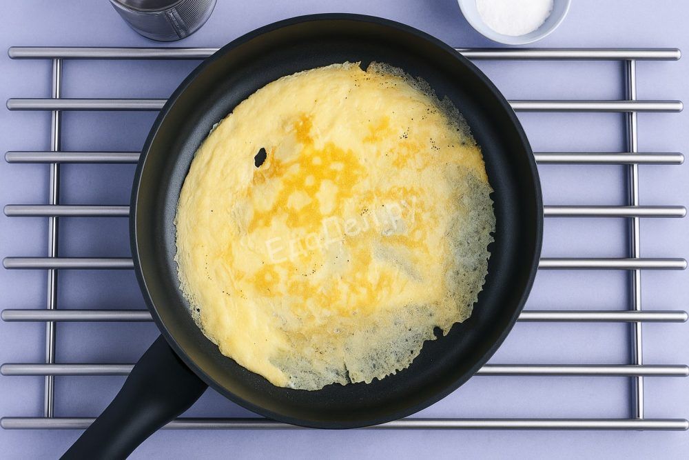 Сковороду слегка смажьте маслом и хорошо прогрейте на среднем огне. Вылейте порцию яичной смеси и распределите по дну, чтобы получился тонкий блинчик. Обжарьте с каждой стороны до румяной корочки. Аналогично приготовьте ещё примерно 6 блинчиков. Советуем не перегревать сковороду, чтобы они не подгорали.