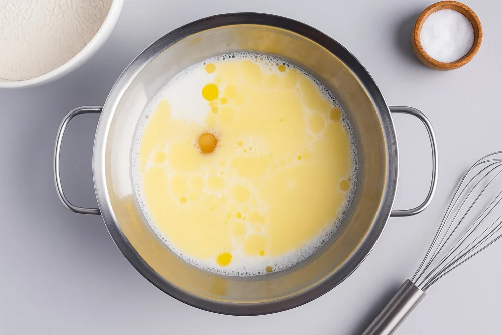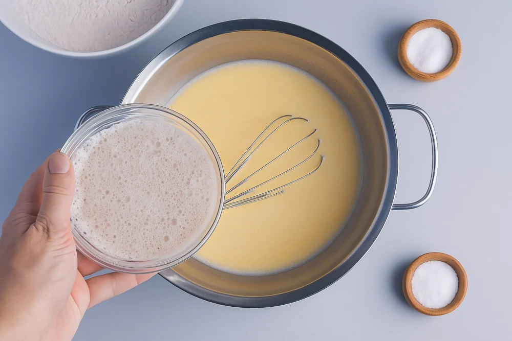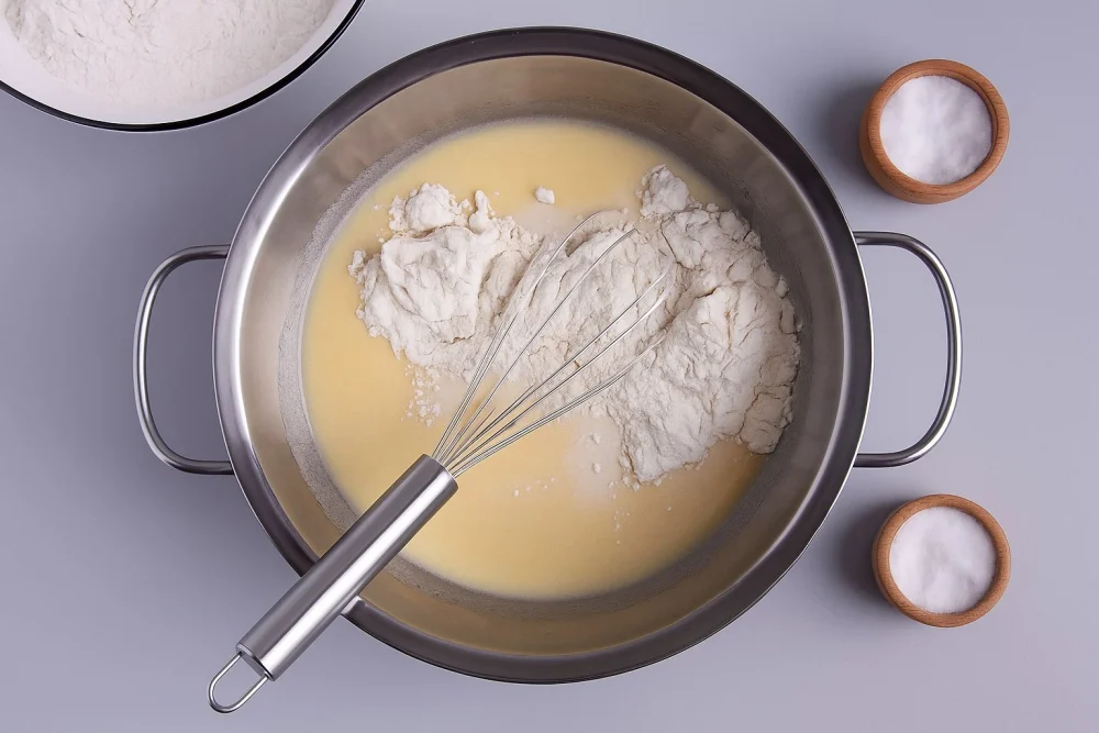 Просейте муку, чтобы насытить её кислородом. Постепенно добавляйте муку к жидкой основе, каждый раз немного размешивая — это поможет получить гладкое тесто без комочков. Накройте миску полотенцем и оставьте на 2 часа в теплом месте. Для лучшей структуры теста перемешайте его 2-3 раза в течение этого времени.