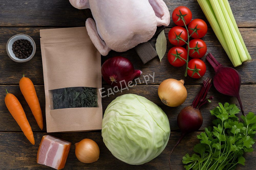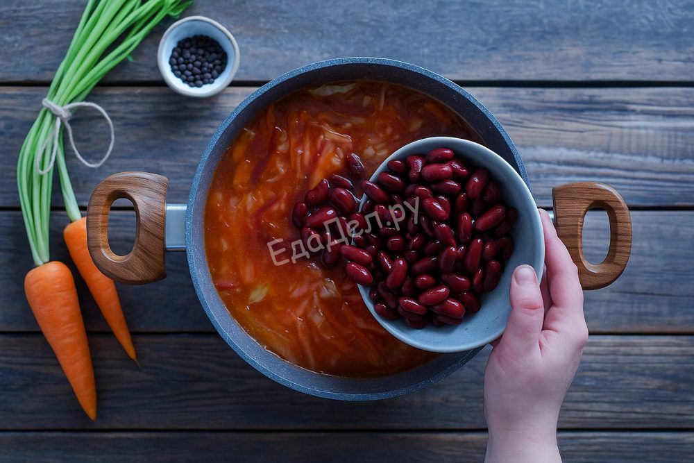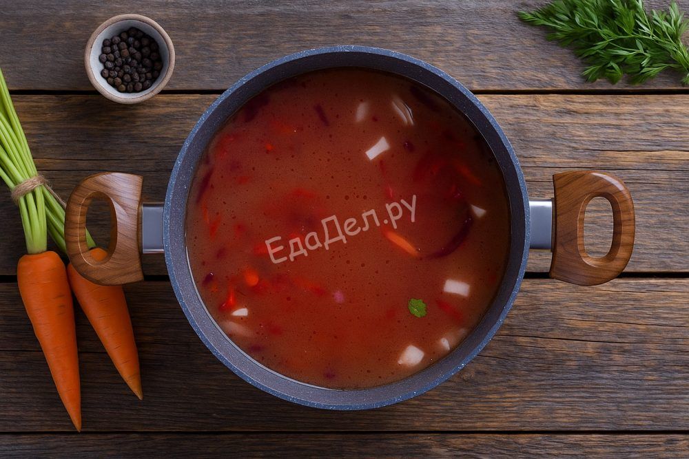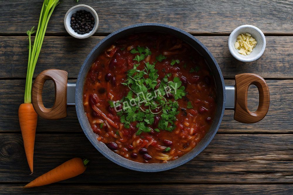 Листья петрушки мелко нарежьте, а чеснок пропустите через пресс или натрите на мелкой тёрке — это придаст борщу особенно свежий и насыщенный аромат. Добавьте зелень и чеснок сразу в готовый суп, перемешайте и снимите с плиты. Дайте настояться под крышкой хотя бы 20-30 минут — борщ станет только вкуснее!