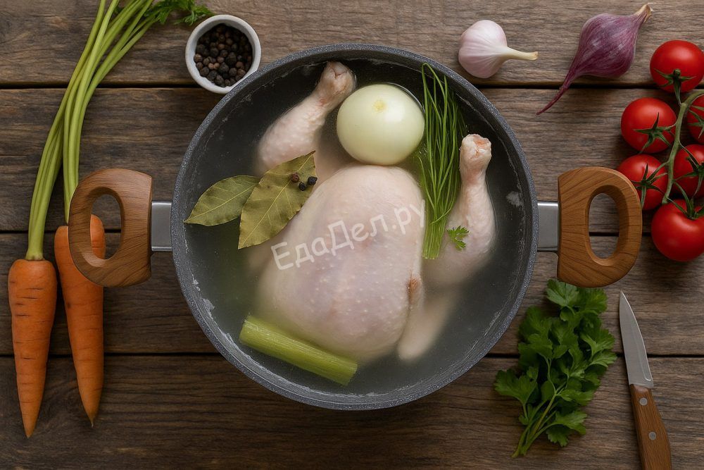 Петрушку хорошо промойте, отделите листья и отложите для последующей подачи. В бульон добавьте стебли петрушки, несколько лавровых листов и чёрный перец горошком. Варите на слабом огне около двух часов, периодически снимая пену и лишний жир, чтобы бульон был прозрачным. Готовый бульон процедите для чистоты вкуса.