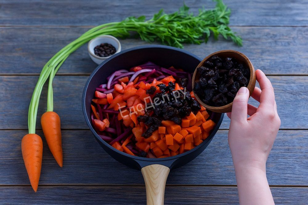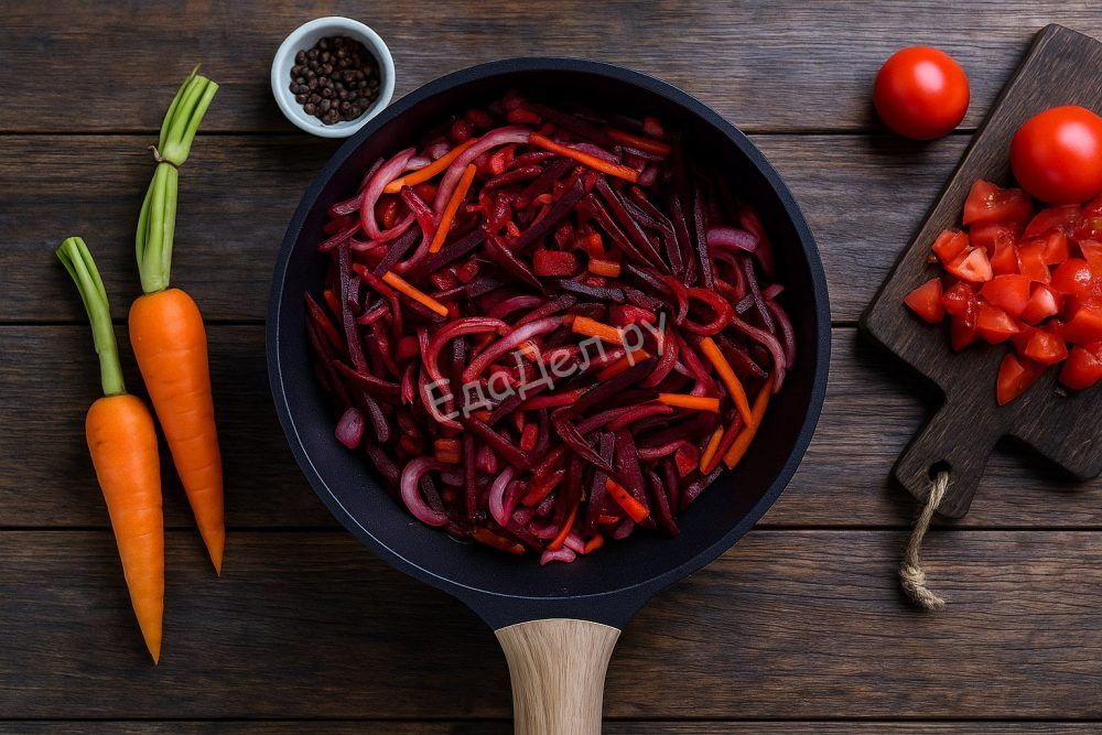 В глубокой сковороде разогрейте растительное масло, выложите копчёную грудинку и обжаривайте до румяной корочки. Затем добавьте лук, морковь и свёклу, хорошо перемешайте и тушите под крышкой 15-20 минут, чтобы овощи стали мягкими. Всыпьте нарезанные помидоры и чернослив, тушите ещё 7-8 минут для гармонии всех вкусов.