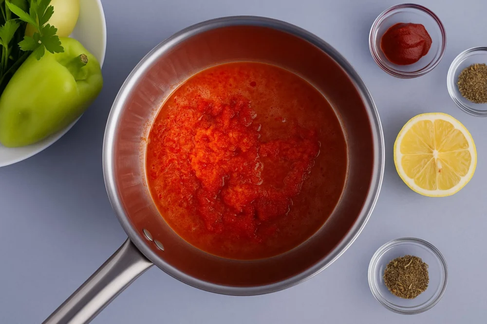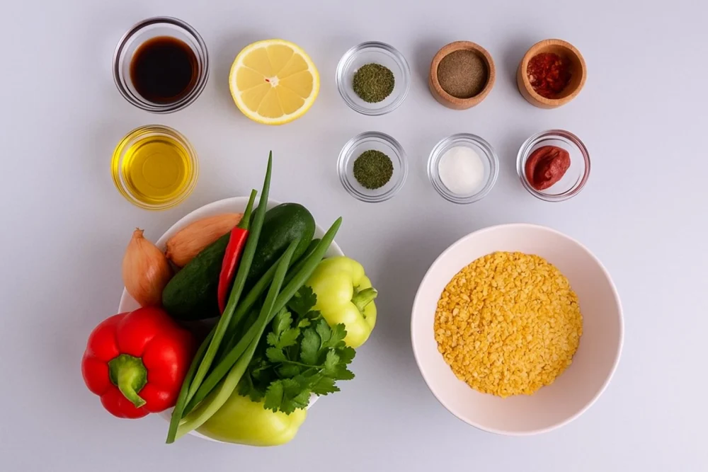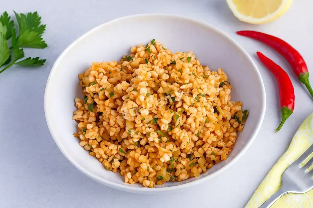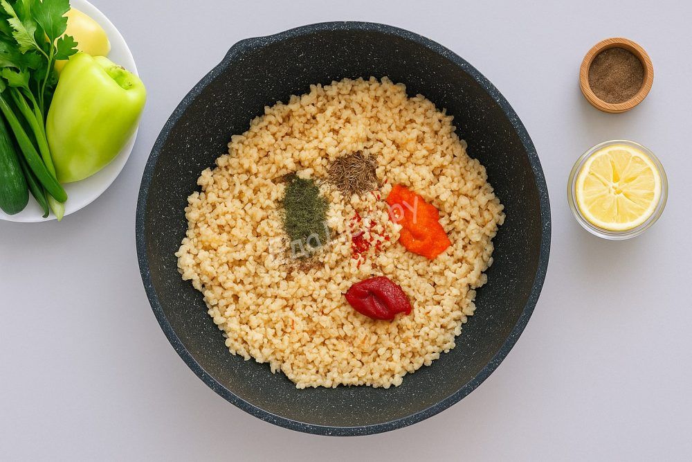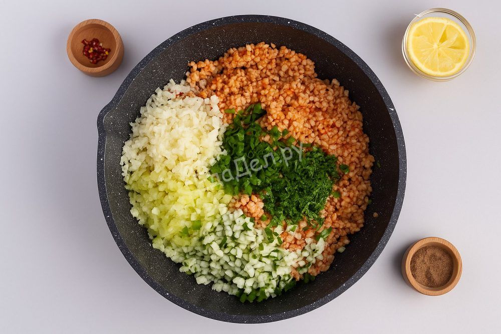 Тёплый булгур переложите в просторную миску. Добавьте перечную пасту, томатную пасту, немного наршараба и немного оливкового масла. Приправьте молотым перцем, зирой, сушёной мятой и острым дроблёным перцем по вкусу. Не забудьте выжать свежий лимонный сок для пикантности. Хорошо перемешайте все ингредиенты — булгур должен равномерно окраситься и пропитаться ароматом.