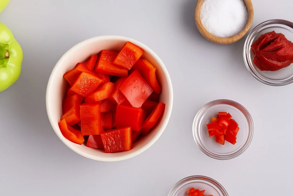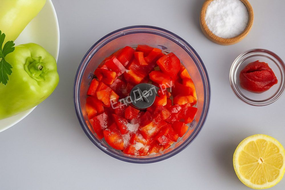 Начните с подготовки перца. У красного болгарского перца аккуратно срежьте плодоножку, удалите семена и перегородки, а мякоть нарежьте некрупными кусочками. Перец чили также очистите от семян и плодоножки, нарежьте мелко. Не забудьте использовать перчатки при работе с острым чили, чтобы избежать неприятных ощущений на коже.