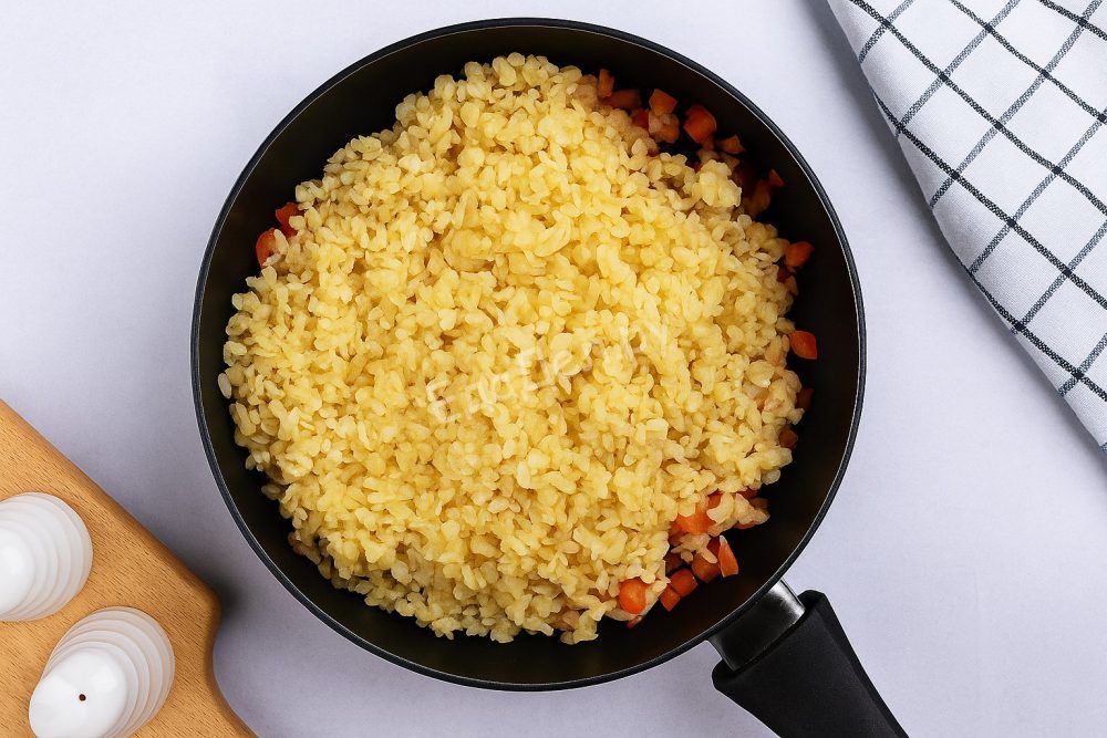 Булгур промойте под проточной водой несколько раз, пока вода не станет прозрачной. Переложите крупу в кастрюлю, залейте горячей водой в соотношении 1:2, добавьте немного соли. Доведите до кипения, затем убавьте огонь до минимума и варите под крышкой 15 минут, пока булгур не станет мягким. Если воды недостаточно, долейте немного кипятка. После приготовления откиньте булгур на сито, чтобы полностью удалить лишнюю жидкость.