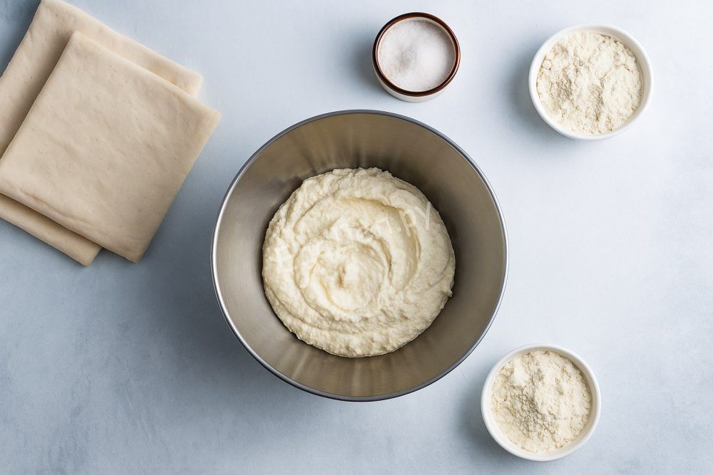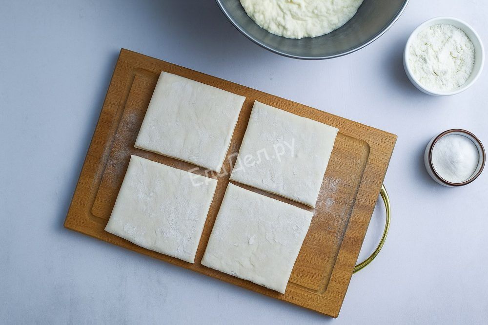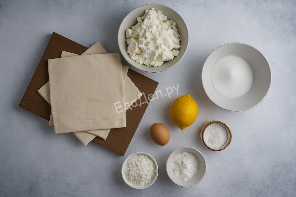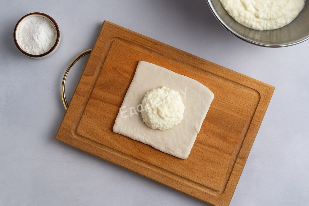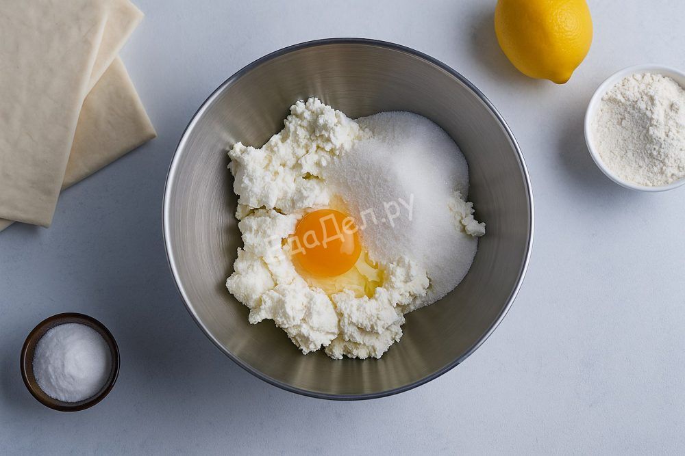 Для начала полностью разморозьте слоёное тесто (нам потребуется 3 стандартных листа по 500 г). Пока оно размягчается, приготовьте начинку: в большой миске соедините творог (лучше использовать более сухой вариант), яйцо, сахар и кукурузный крахмал. Перемешивайте до однородности, чтобы масса получилась нежной.
