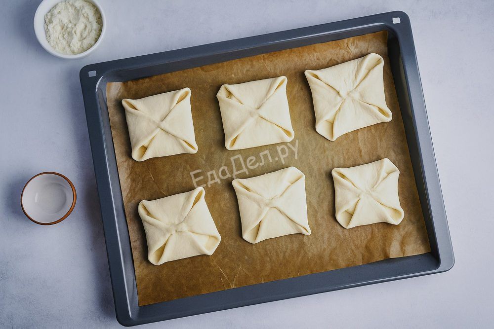 Переложите заготовки на противень, выстланный силиконовым ковриком (или бумагой для выпечки), оставляя между булочками немного места для подъёма. Выпекайте в разогретой до 200 градусов духовке 15–20 минут до золотистой корочки. Готовые булочки слегка остудите, а перед подачей присыпьте сахарной пудрой для аппетитного вида.