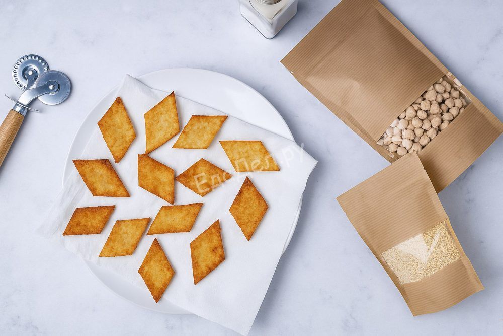 Разогрейте масло во фритюрнице или глубокой сковороде до 170–175 °C. Жарьте заготовки небольшими порциями 30–60 секунд с каждой стороны до золотистого цвета. Переложите на бумажные полотенца, сразу посолите и остудите на решётке. Совет: можно запечь на пергаменте, смазав поверх маслом, при 200 °C 8–10 минут, перевернув на середине.