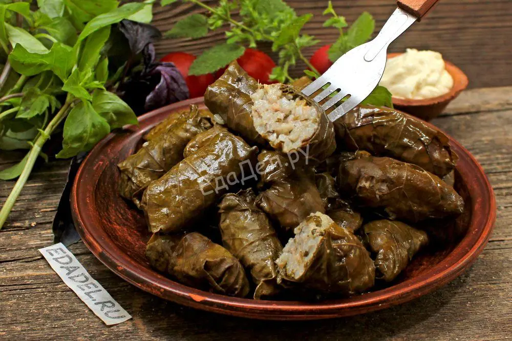 Раскладываем листья на рабочей поверхности ребристой стороной вверх. Кладем начинку, примерно по чайной ложке или меньше, если листочки миниатюрные. Сначала заворачиваем на начинку нижние края листа. Потом по сторонам и сворачиваем конвертиком. Чтобы голубцы не развернулись в процессе приготовления, легонько сжимаем в ладони.