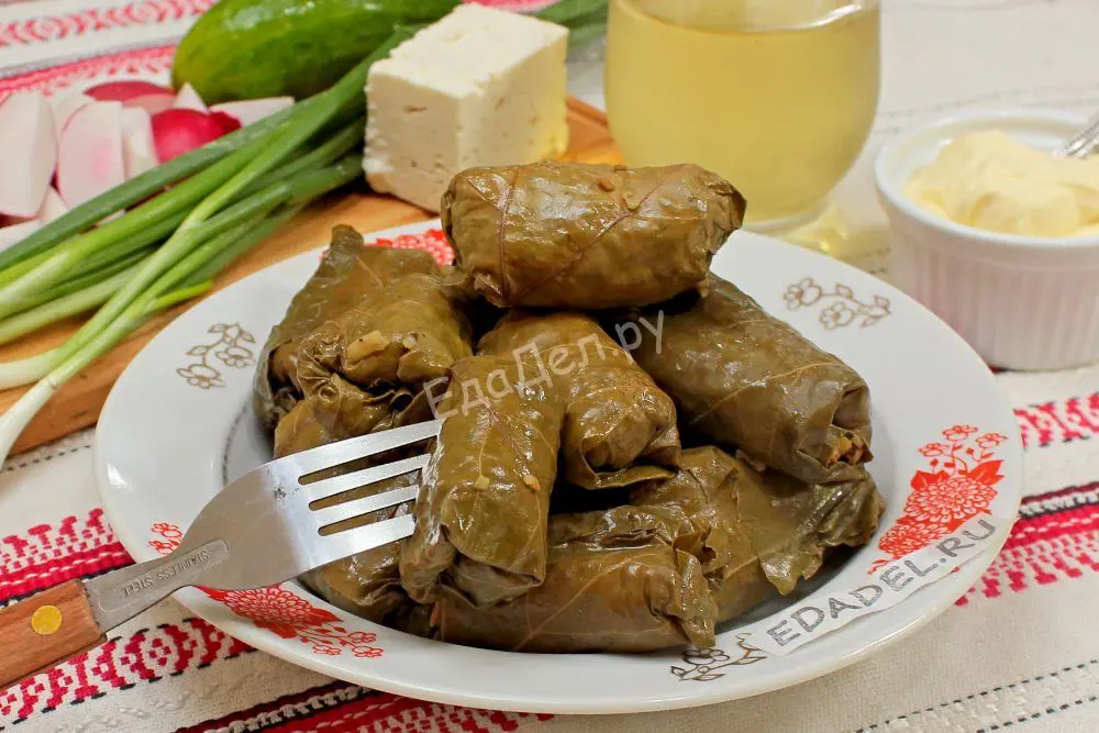 Перед фаршировкой листья нужно размягчить, чтобы они легче скручивались в миниатюрные голубцы. Перекладываем листочки небольшими партиями по 20-25 штук в миску и заливаем крутым кипятком на несколько минут. Как только цвет станет оливковым, вынимаем и подставляем под струю холодной воды. Настой, в котором запаривали листья, не выливаем, он понадобится для заливки.