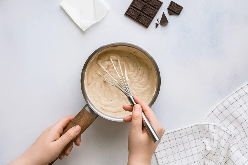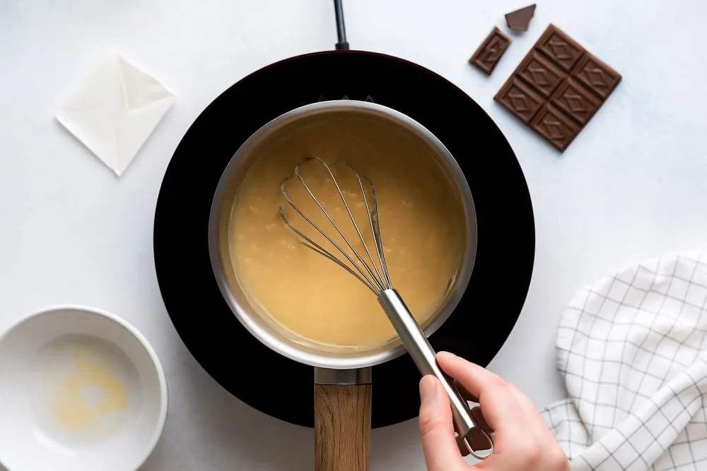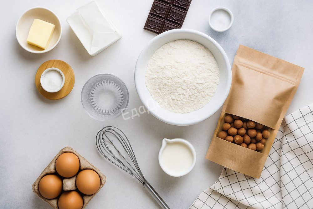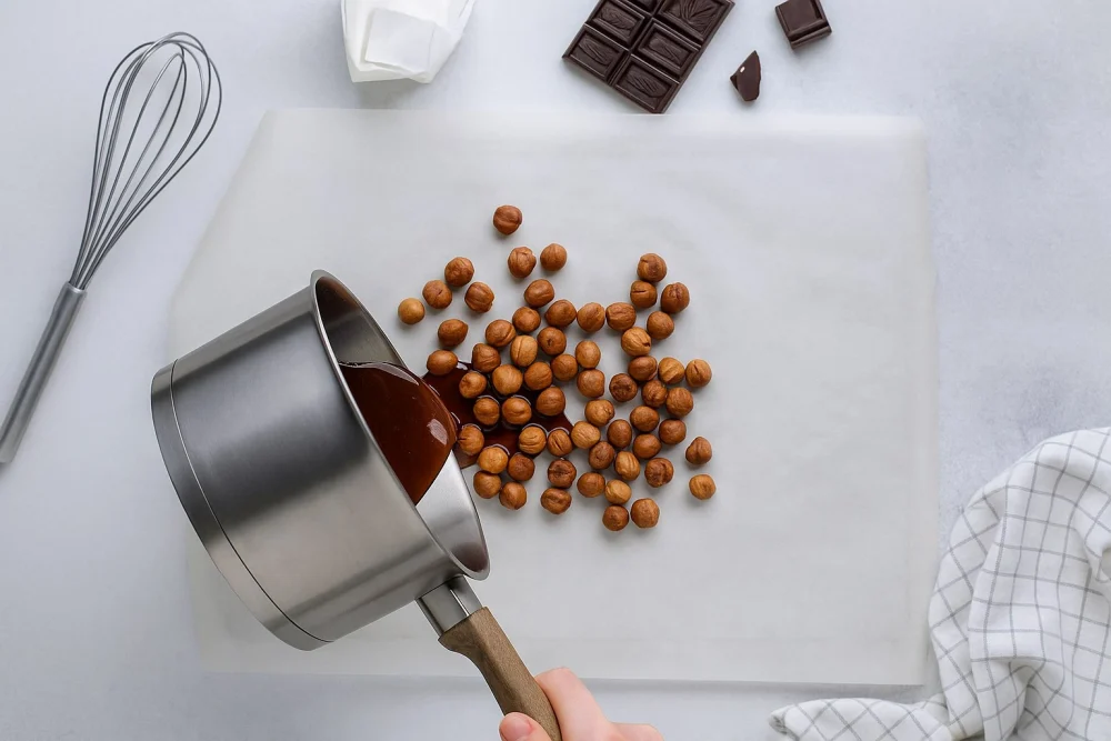 Для начинки: застелите доску пергаментом и распределите фундук. В сотейнике растопите сахар с 1 ст. л. воды до янтарного цвета, не мешая ложкой — только покачивая посуду. Вылейте карамель на орехи и дайте полностью застыть; для яркости вкуса фундук можно предварительно подсушить 5–7 минут при 160 °C.