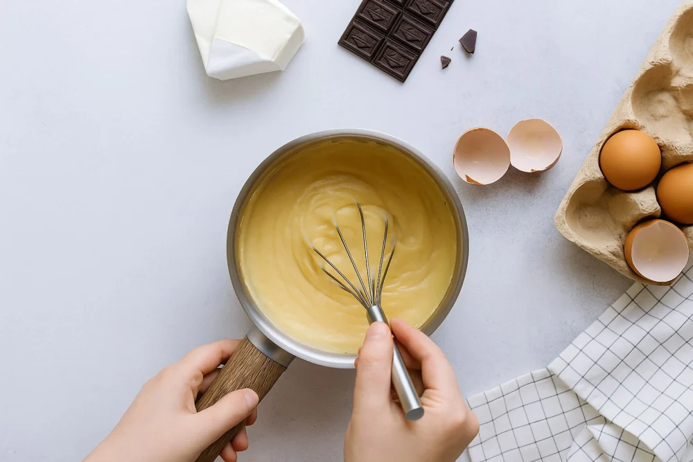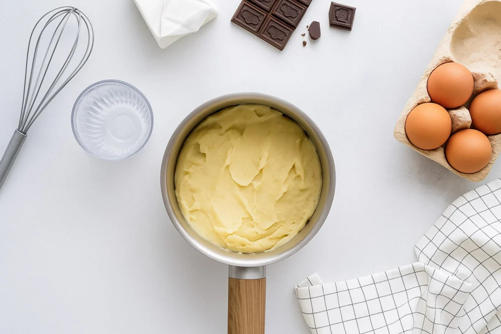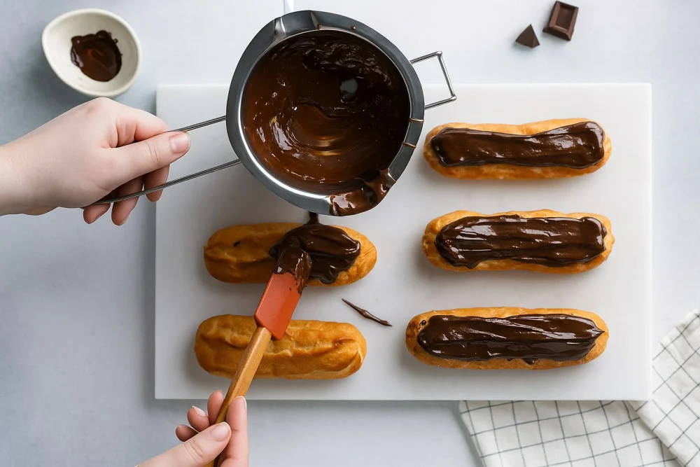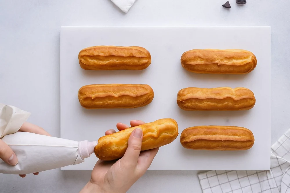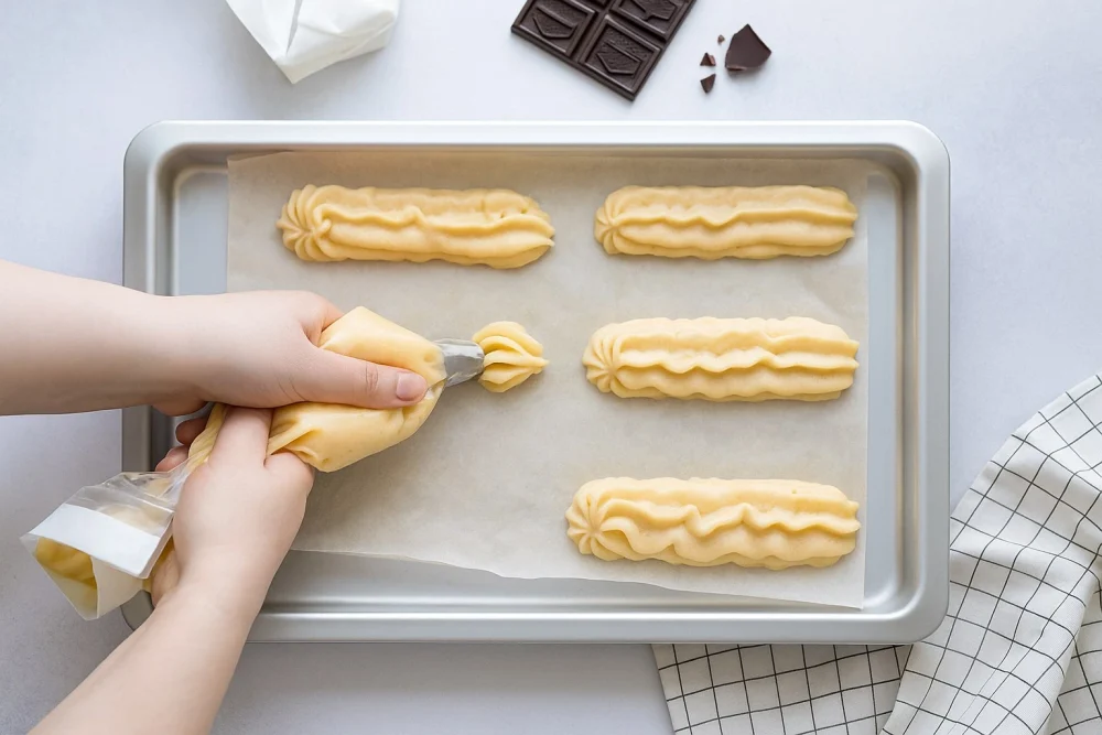 Переложите тесто в кондитерский мешок с широкой насадкой. Отсадите эклеры на противень с пергаментом, оставляя промежутки. Выпекайте при 200 °C 10 минут, затем снизьте до 170 °C и пеките ещё 15–20 минут до устойчивой румяности; первую половину времени духовку не открывайте. Оставьте в выключенной духовке с приоткрытой дверцей на 5 минут для подсушивания.