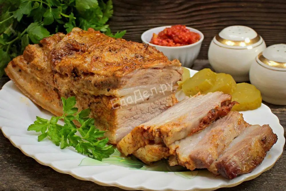 Перед запеканием грудинку зачищаем. Переворачиваем шкуркой вверх и ножом соскребаем нагар и прочие загрязнения. Нож держим перпендикулярно мясу, счищаем нагар от середины к краям. Шкурка должна стать светлой, без коричневых подпалин. Споласкиваем мясо под холодной водой, обсушиваем или обтираем бумажным полотенцем.