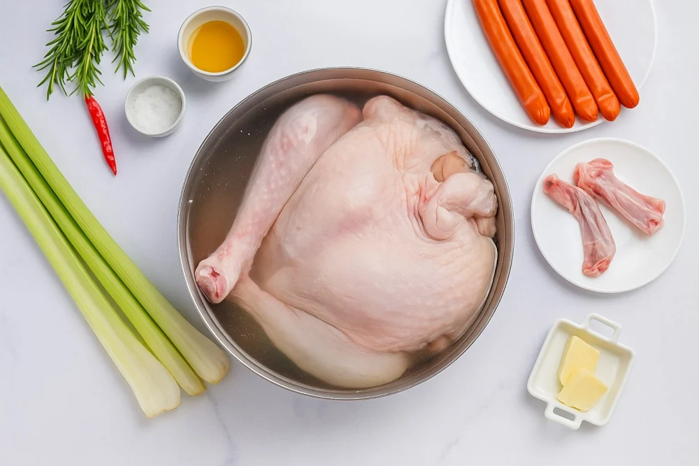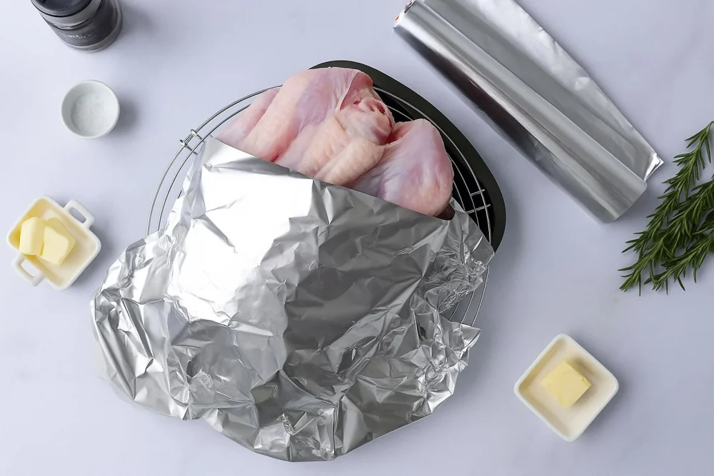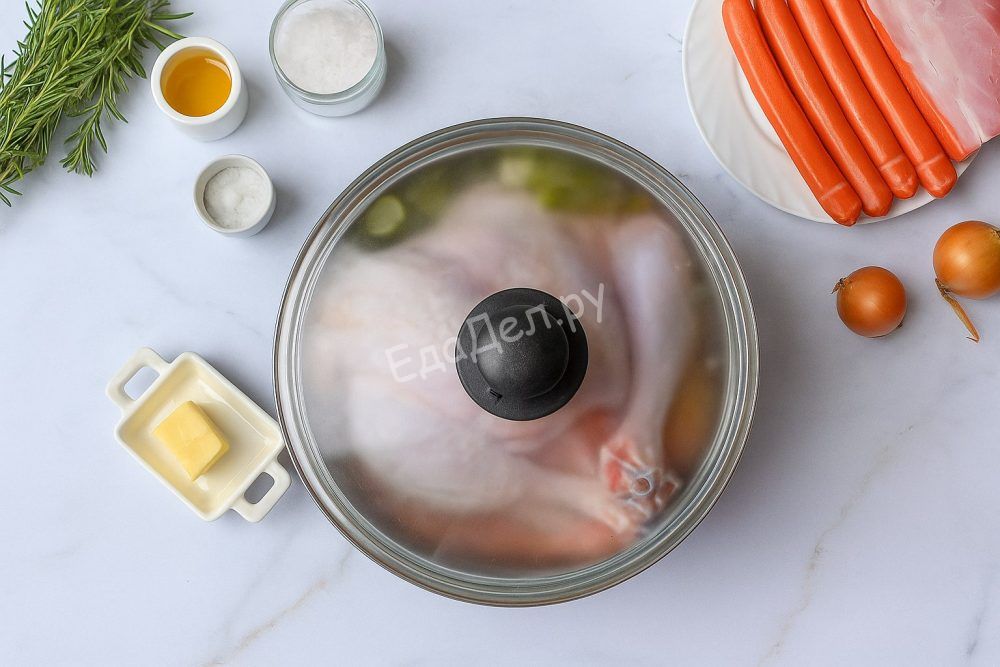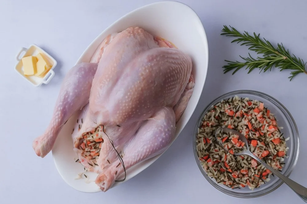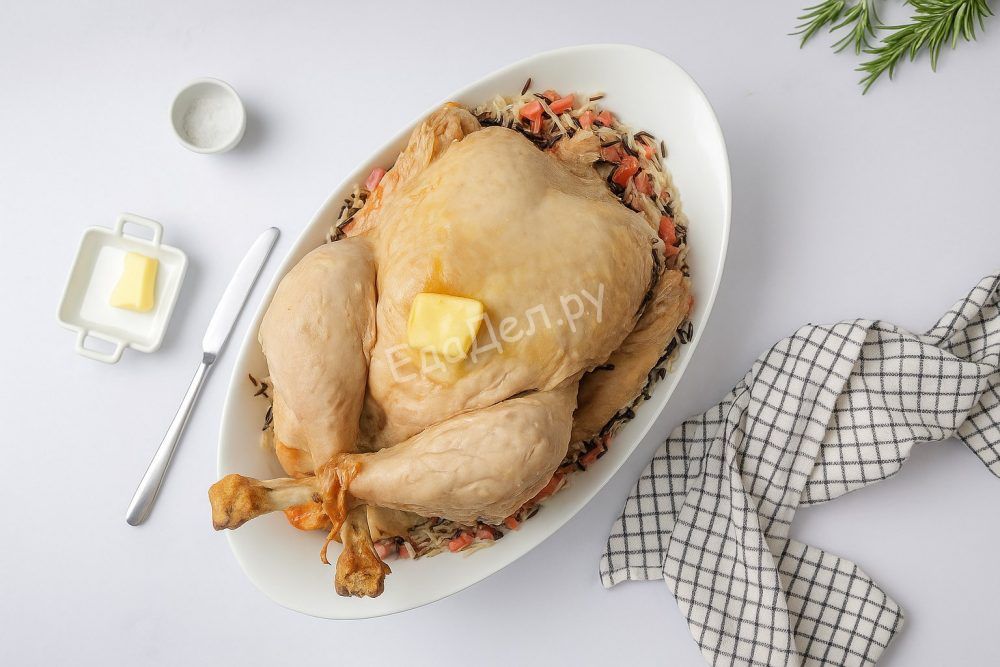Снимите фольгу, перелейте соки из противня в форму с начинкой. Смажьте индейку растопленным сливочным маслом, переложите в форму и запекайте ещё 30–45 минут до румяной кожи, смазывая каждые 10–15 минут. Готовность — 72–74 °C в грудке и 80–82 °C в бедре. Дайте отдохнуть под фольгой 20–30 минут, удалите нитки и подавайте.