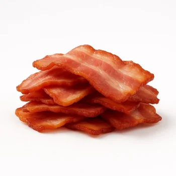 Бекон — это продукт из специально отобранных и засоленных срезов свиной корейки или брюшины с прослойками мяса и жира, который может подвергаться копчению или варке для получения характерного аромата и вкуса. Бекон отличается ярко выраженным мясным вкусом, сочетающимся с нежностью и легкой солоноватой ноткой жира, а после термической обработки приобретает аппетитный хрустящий вид, золотисто-коричневую корочку и неповторимый аромат. Основная ценность бекона заключается в его высокой питательной плотности: на 100 г продукта приходится значительное количество животного белка и жира. В состав входят витамины группы B, а также минералы — железо, фосфор, кальций, селен, магний — что способствует поддержанию нервной и мышечной систем, укреплению костей и повышению энергетического тонуса. Бекон — популярный ингредиент различных кухонь мира и основа для завтраков, сэндвичей, салатов, пасты, супов, закусок, выпечки, омлетов и гарниров. Этот продукт идеально сочетается с яйцами, сырами, овощами, бобовыми, хорошо подходит для запекания и обжаривания, придавая блюдам насыщенный вкус и текстуру. Бекон не рекомендуется употреблять в больших количествах ввиду высокого содержания соли, насыщенных жиров и калорий, его стоит включать в рацион умеренно. Для сохранения свежести бекон хранят в герметичной упаковке в холодильнике. Натуральный бекон отличается однородной структурой и красивым чередованием мясных и жировых прослоек, обладает высокой кулинарной ценностью даже в минимальных количествах. Он быстро готовится, облегчает создание ярких и запоминающихся вкусовых сочетаний и удовлетворяет чувство голода.