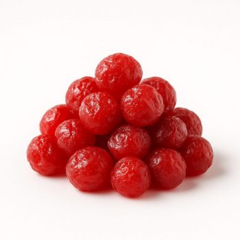 Цукаты из вишни — это сладкое лакомство, приготовленное путём длительного вываривания свежих или мороженых вишневых ягод в сахарном сиропе с последующей сушкой до получения плотной, слегка упругой текстуры. Благодаря этому процессу ягоды сохраняют насыщенный вишневый вкус, яркий цвет, насыщенный аромат и лёгкую кислинку, характерную исходному фрукту. В процессе изготовления значительная часть влаги уходит, а количество сахаров возрастает, вишня приобретает приятную тягучесть и становится отличным ингредиентом для выпечки, десертов, украшения тортов, шоколада, мороженого или мюсли. Цукаты из вишни часто используют в кексовом или рождественском хлебе, придают выпечке красивый цвет и фруктовый акцент. Кроме того, такие цукаты богаты быстрыми углеводами и дарят мгновенный прилив энергии. В них сохраняются в умеренных количествах витамины группы B и C, а также минеральные вещества: калий, магний, железо, кальций, что оказывает положительное влияние на общее состояние организма, поддерживает иммунитет и обмен веществ. Благодаря отсутствию жиров, цукаты подходят для лакто- и вегетарианцев и могут использоваться во время поста. Однако цукаты достаточно калорийны из-за высокого содержания сахара, их рекомендуется употреблять умеренно, особенно людям, следящим за уровнем сахара в рационе. Хранить цукаты следует в герметичной ёмкости в прохладном сухом месте, чтобы сохранить их аромат, текстуру и полезные свойства.